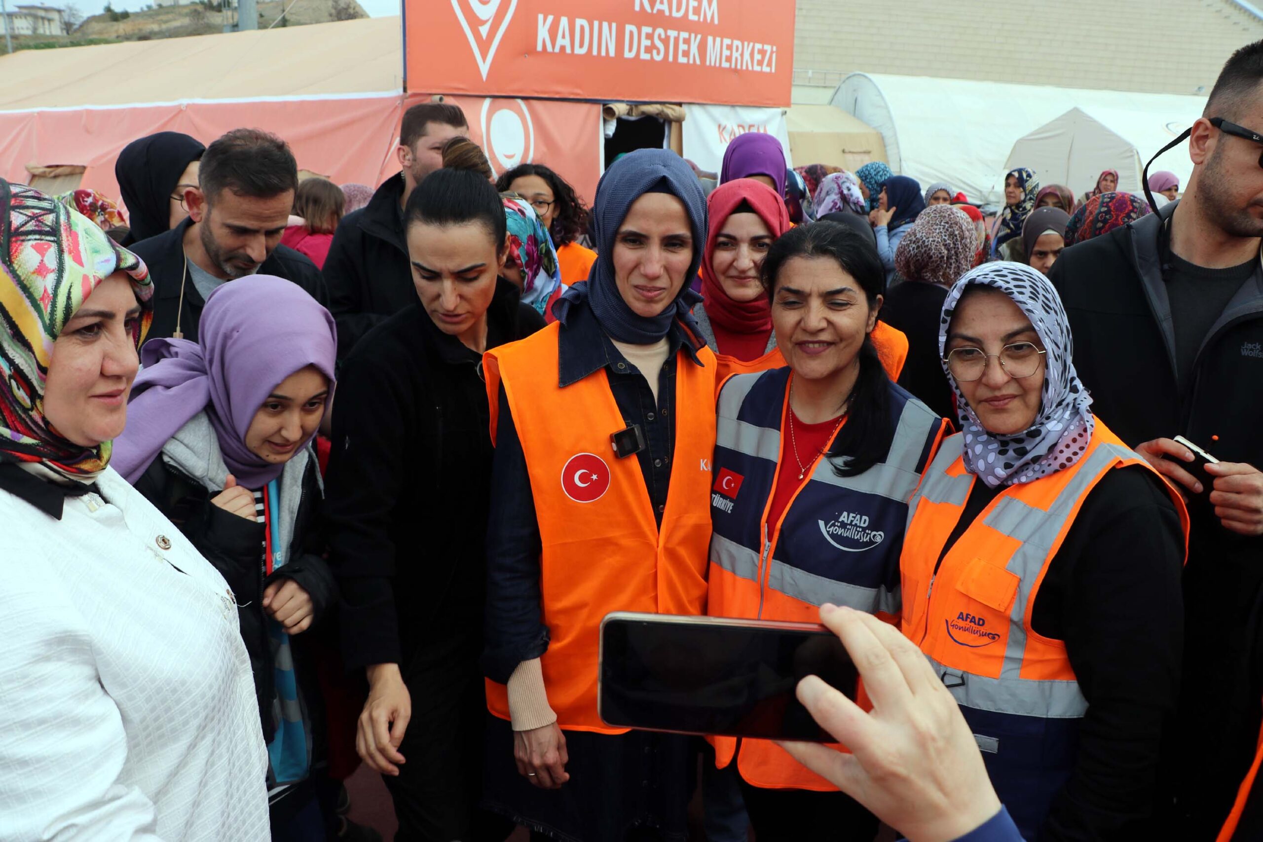 KADEM Mütevelli Heyeti Başkanı Sümeyye Erdoğan Bayraktar, 8 Mart Dünya Kadınlar Günü’nde Kahramanmaraş Sütçü İmam Üniversitesi kampüsünde kurulan çadır kente geldi. Bayraktar ve beraberindekiler, çadırları gezerek depremzedelerle sohbet etti. Depremzedelerin hayata tutunmaya çalıştıklarını söyleyen Bayraktar, “Zamanla artık psikolojik, sosyal desteklerin biraz daha öne çıktığını görüyoruz. Bir haftadır Kahramanmaraş ve Adıyaman’da Kadın Destek Merkezlerini başlattık. Bugün Hatay’da bir merkezimiz daha ekleniyor. Buralarda da hem sosyal hizmet uzmanlarımız hem psikologlarımız hem de gönüllülerimiz aracılığıyla olabildiğince onların sorunlarını dinleyip çözümler üretmeye çalışıyoruz. Sıcak ortam sağlamaya çalışıyoruz. Gündelik hayatlarında yaptıkları el işidir, kısır, sarma yapmaktır veya sadece sohbet edip içini dökmektir, bu gibi faaliyetleri de yapabileceği bir ortam sağlıyoruz” diye konuştu.
