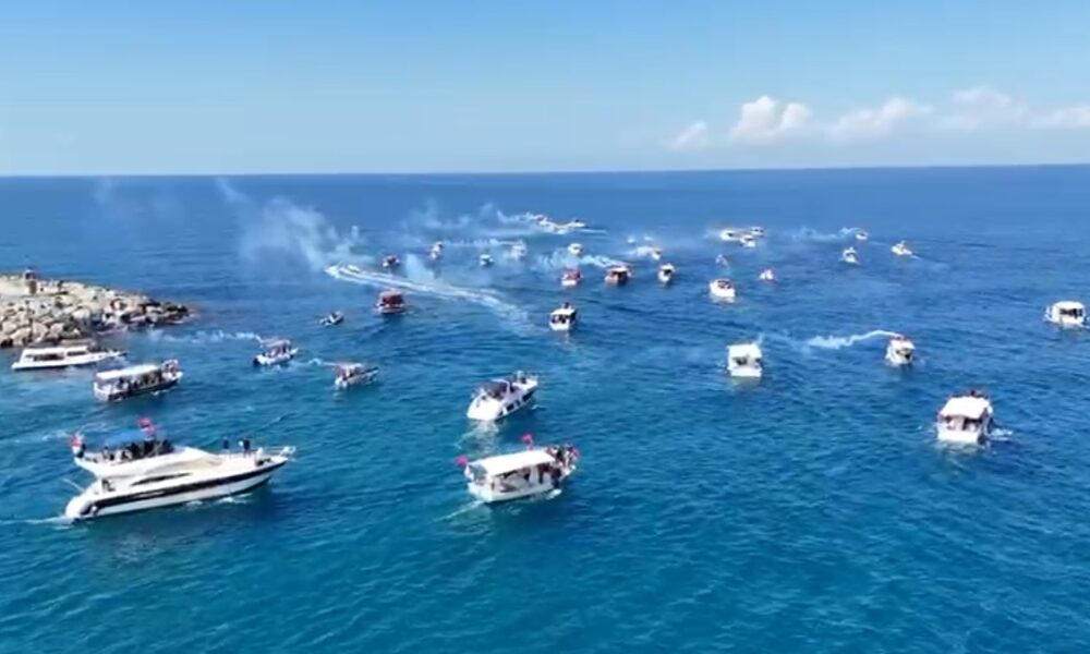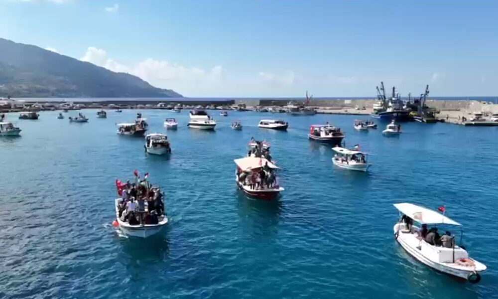• Hatay'ın Arsuz ilçesinde çok sayıda tekne, Gazze'ye insani yardım ulaştırmak amacıyla yola çıkan ancak İsrail'in saldırısına uğrayan Küresel Sumud Filosu'na destek vermek için tur düzenledi. Fotoğraf: Ufuk AKTUĞ/İskenderun(Hatay),(DHA)