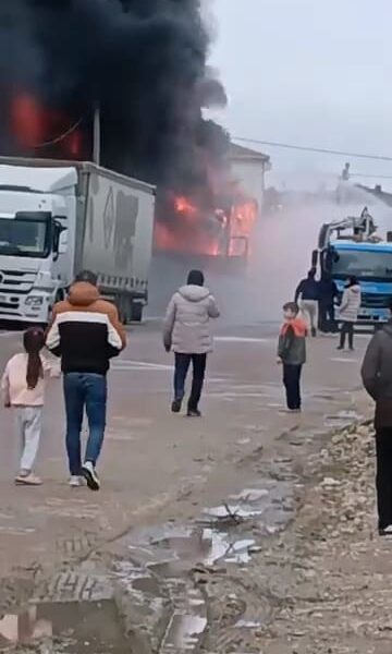 Mesudiye Mahallesi Meydan Sokak’ta saat 12.30 sıralarında park halindeki sünger yüklü 16 BRT 373 plakalı TIR’ın dorsesinde yangın çıktı. Büyüyen alevler hemen yanında park halinde bulunan çekicisiz mobilya yüklü 16 BDD 870 plakalı dorseye de sıçradı. 2 dorse alev alev yanarken, yükselen dumanlar ilçenin birçok noktasından görüldü. Elektrik tellerinin de zarar gördüğü yangında zaman zaman patlamalar yaşandı.