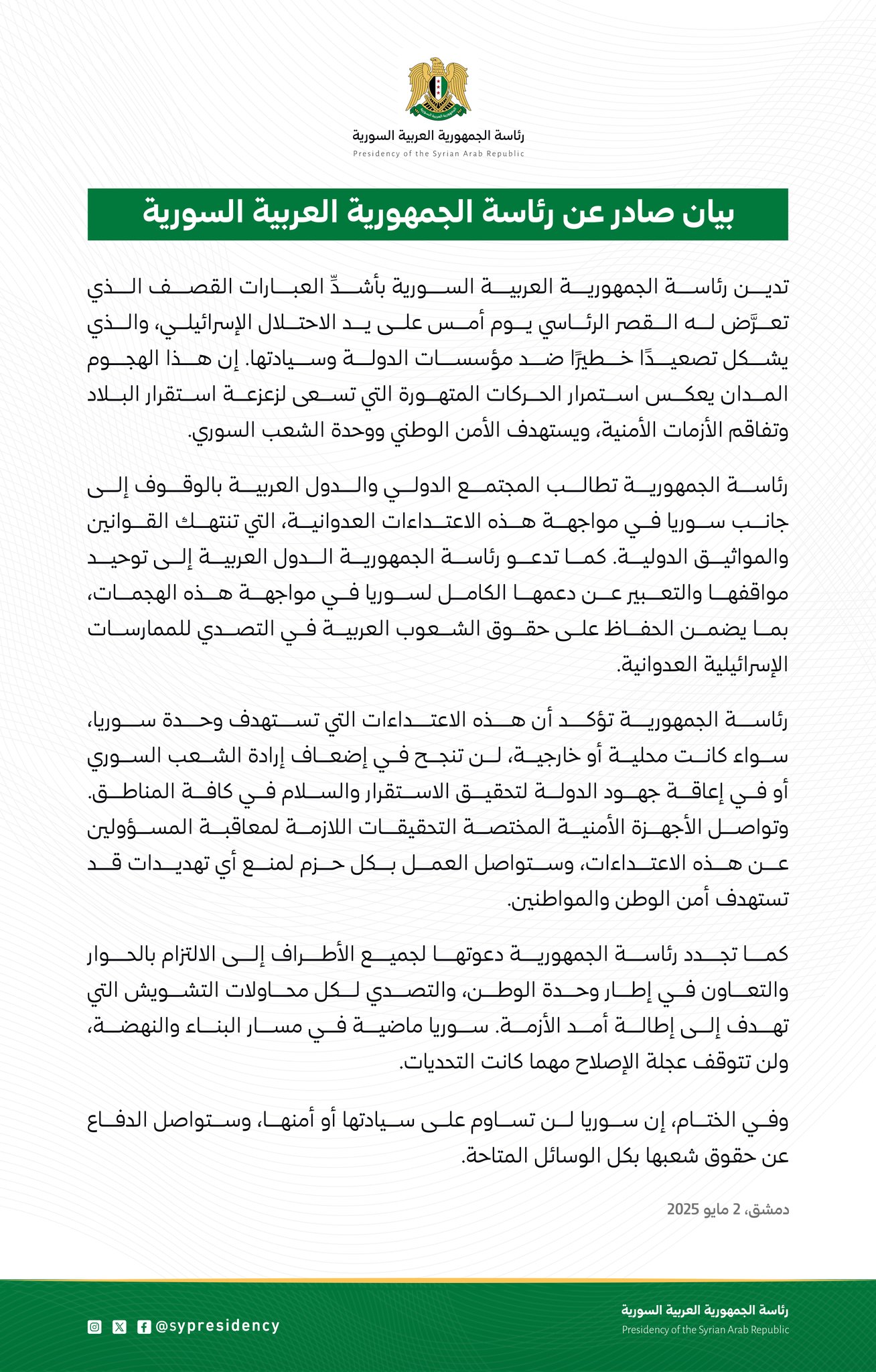 İsrail Savunma Kuvvetlerinden (IDF) yapılan açıklamada, Suriyenin başkenti Şamdaki Cumhurbaşkanlığı Sarayı’nın yakınlarına saldırı düzenlendiği bildirildi. Suriye Cumhurbaşkanlığı tarafından yapılan açıklamada, saldırının kınandığı belirtildi. Açıklamada, “Bu menfur saldırı, Suriye halkının ulusal güvenliğini ve birliğini hedef alan, ülkeyi istikrarsızlaştırma ve güvenlik krizini derinleştirme yönündeki pervasız çabaların bir yansımasıdır. Cumhurbaşkanlığı, uluslararası topluma ve Arap ülkelerine, uluslararası hukuk ve sözleşmeleri ihlal eden bu saldırgan saldırılara karşı Suriyenin yanında yer alma çağrısında bulunuyor. Cumhurbaşkanlığı ayrıca Arap ülkelerini, Suriyeye yönelik bu saldırılara karşı tavırlarını birleştirmeye ve Arap halklarının İsrailin saldırgan uygulamalarına karşı koyma haklarının korunmasını güvence altına almaya çağırıyor” denildi.