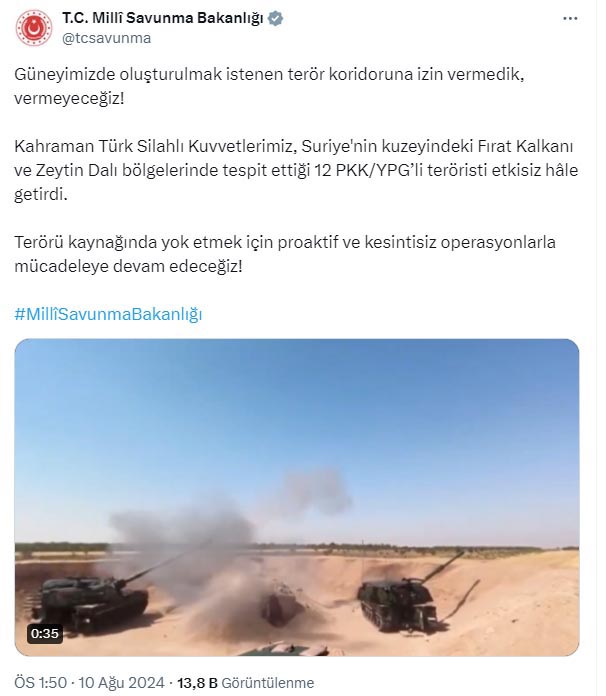 Bakanlığın sosyal medya hesabından yapılan açıklamada, “Güneyimizde oluşturulmak istenen terör koridoruna izin vermedik, vermeyeceğiz. Kahraman Türk Silahlı Kuvvetlerimiz, Suriyenin kuzeyindeki Fırat Kalkanı ve Zeytin Dalı bölgelerinde tespit ettiği 12 PKK/YPG’li teröristi etkisiz hale getirdi. Terörü kaynağında yok etmek için proaktif ve kesintisiz operasyonlarla mücadeleye devam edeceğiz” denildi.