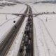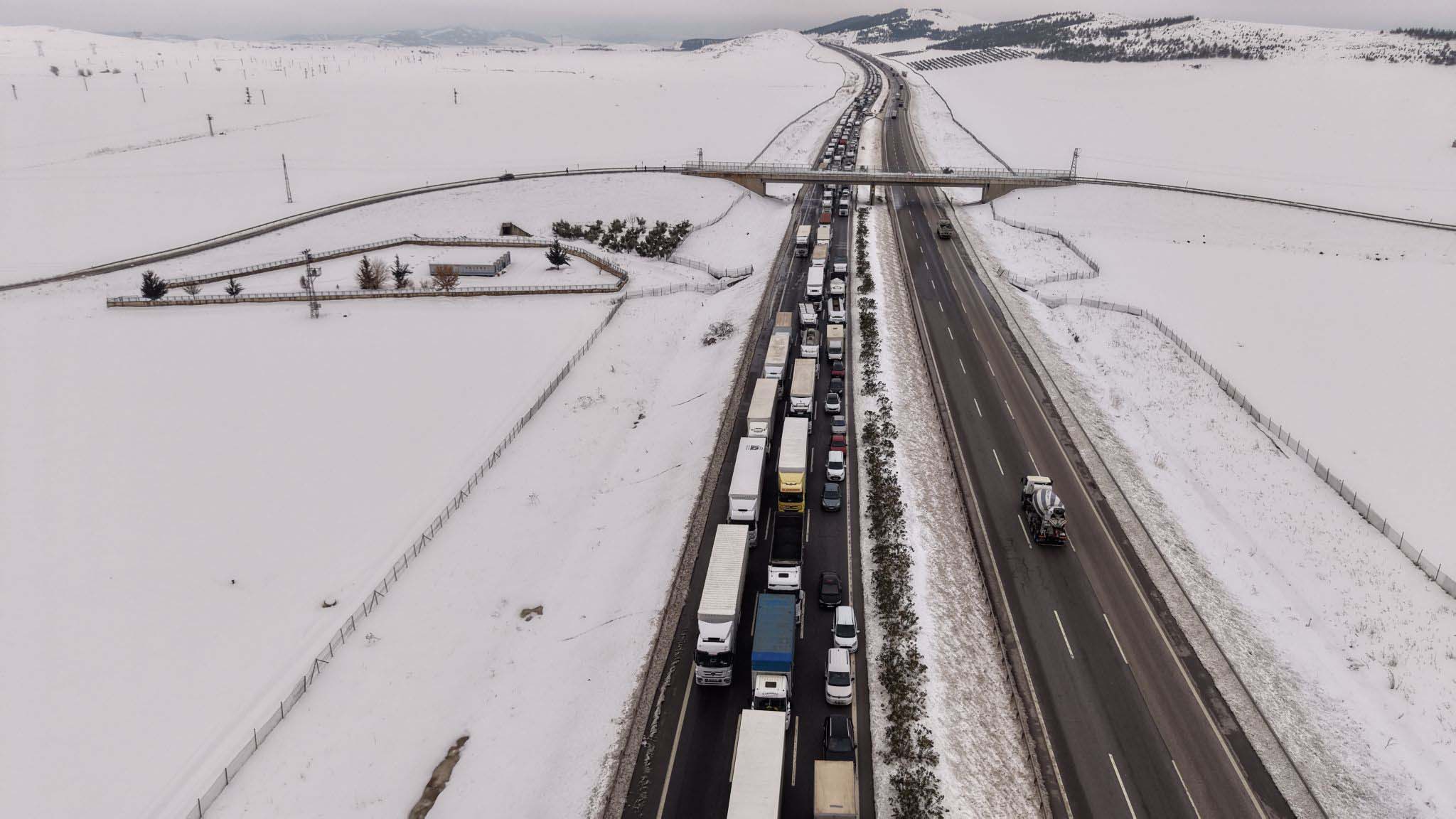 Zaman zaman ulaşımın devam ettiği yolda araçlar güçlükle ilerliyor. Oluşan yoğunluk dron kamerasıyla görüntülendi.
