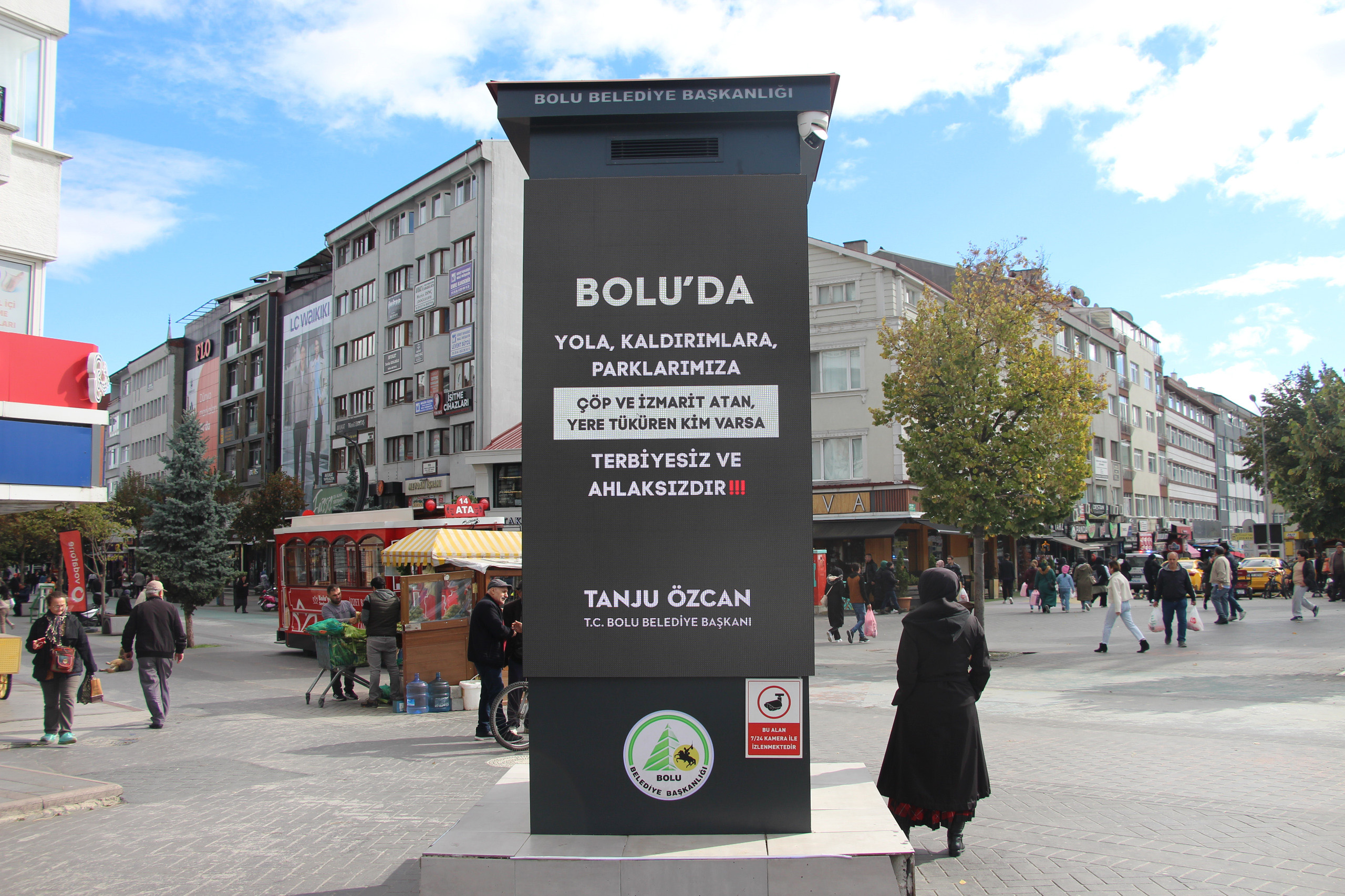 Bolu Belediye Başkanı Tanju Özcanın, çevreyi kasten kirletenlere yönelik 14 bin 407 liraya kadar para cezası kesileceğini açıklamasının ardından, zabıta ekipleri tarafından şehir genelinde denetimler sıklaştırıldı. Kameralarla tespit edilen kişilere para cezası uygulanıyor. Bu kapsamda, kent merkezindeki elektronik reklam panolarında, Bolu Belediye Başkanı Tanju Özcanın mesajı yayımlandı. Başkan Özcanın, mesajında, “Boluda yola, kaldırıma, parklarımıza çöp ve izmarit atan, yere tüküren kim varsa terbiyesiz ve ahlaksızdır” denildi.