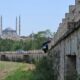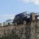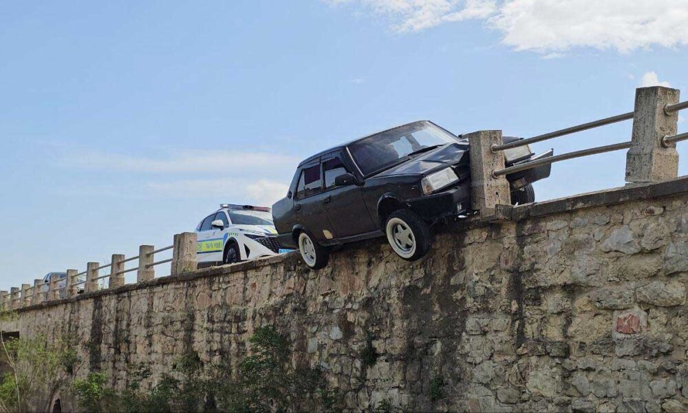 Tarihi köprünün bariyerine çarpan otomobil asılı kaldı
