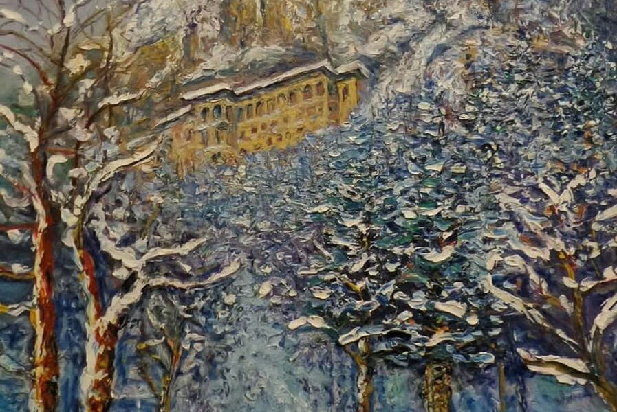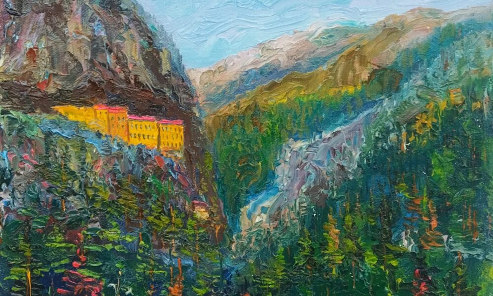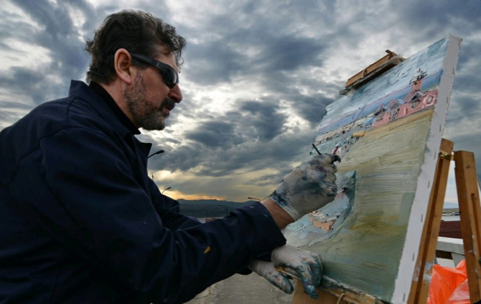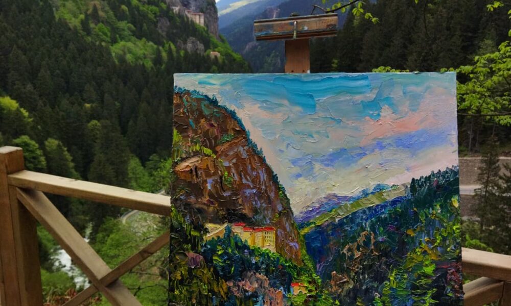 Trabzonlu ressam Abdulkadir Yıldırım (Fotoğrafta) kar yağışının ardından oluşan manzarayı ve Maçka ilçesindeki Sümela Manastırı’nı yamaca kurduğu seyyar şövalesiyle tuvaline yansıttı. Fotoğraf: Trabzon, (DHA)