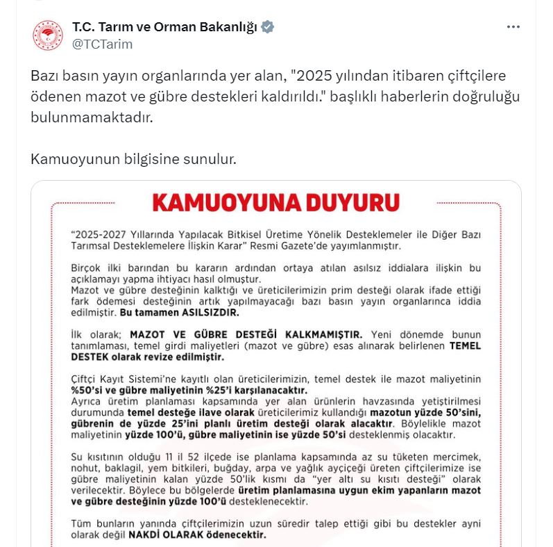 Bakanlığın sosyal medya hesabından yapılan açıklamada, 2025-2027 Yıllarında Yapılacak Bitkisel Üretime Yönelik Desteklemeler ile Diğer Bazı Tarımsal Desteklemelere İlişkin Kararın bugün Resmi Gazetede yayımlandığı hatırlatarak, birçok ilki barından bu kararın ardından ortaya bazı asılsız iddialar atıldığı belirtildi. Bazı basın yayın organlarında; mazot ve gübre desteğinin kalktığı ve üreticilerin prim desteği olarak ifade ettiği fark ödemesi desteğinin artık yapılmayacağının iddia edildiği ancak bunun tamamen asılsız olduğu vurgulanarak, “İlk olarak; mazot ve gübre desteği kalkmamıştır. Yeni dönemde bunun tanımlaması, temel girdi maliyetleri (mazot ve gübre) esas alınarak belirlenen Temel Destek olarak revize edilmiştir. Çiftçi Kayıt Sistemine kayıtlı olan üreticilerimizin, temel destek ile mazot maliyetinin yüzde 50si ve gübre maliyetinin yüzde 25i karşılanacaktır. Ayrıca üretim planlaması kapsamında yer alan ürünlerin havzasında yetiştirilmesi durumunda temel desteğe ilave olarak üreticilerimiz kullandığı mazotun yüzde 50sini, gübrenin de yüzde 25ini planlı üretim desteği olarak alacaktır. Böylelikle mazot maliyetinin yüzde 100ü, gübre maliyetinin ise yüzde 50si desteklenmiş olacaktır” denildi.