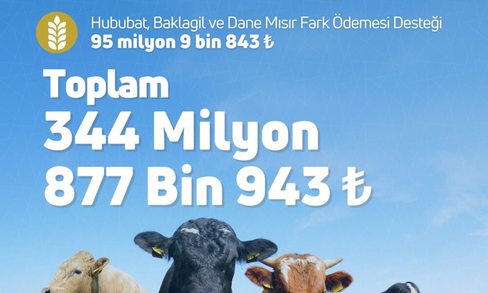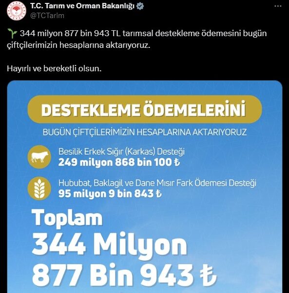Bakanlığın sosyal medya hesabından yapılan yazılı açıklamada, “344 milyon 877 bin 943 TL tarımsal destekleme ödemesini bugün çiftçilerimizin hesaplarına aktarıyoruz. Hayırlı ve bereketli olsun” ifadelerine yer verildi.