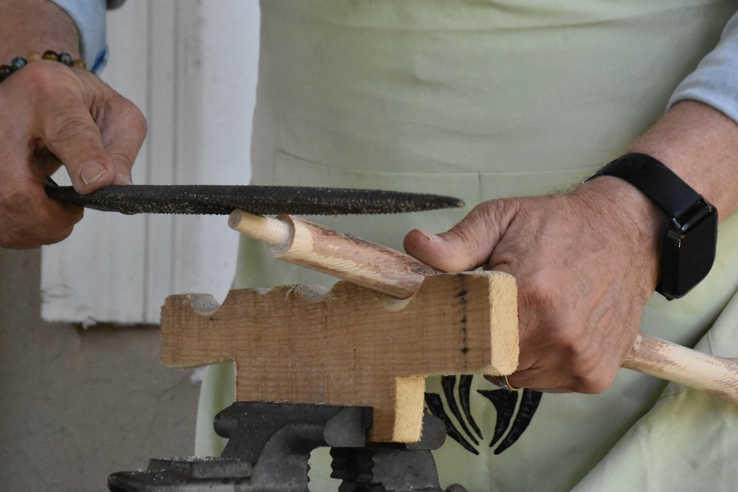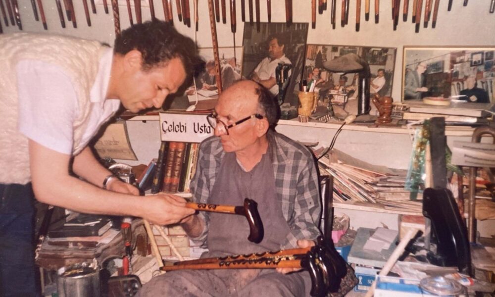 İzmir'de yaşayan ve öğretmen olarak atandığı Zonguldak'ta baston yapımını öğrenen Erdoğdu Özcan (sağda), 37 yıldır baston üretiyor. Fikri Sağlar (yeşil ceketli). Fotoğraf: Seza Nur ALPDÜNDAR/İzmir,(DHA)