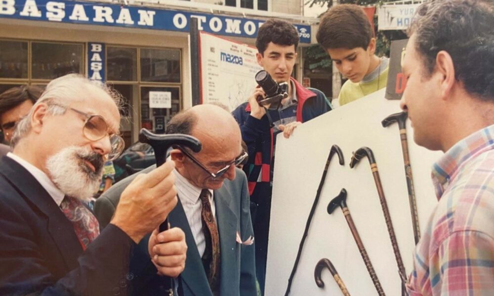 İzmir'de yaşayan ve öğretmen olarak atandığı Zonguldak'ta baston yapımını öğrenen Erdoğdu Özcan (Sağda), 37 yıldır baston üretiyor. Fakir Baykurt (Ortada). Fotoğraf: Seza Nur ALPDÜNDAR/İzmir, (DHA)
