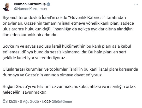 TBMM Başkanı Kurtulmuş, sosyal medya hesabından yaptığı açıklamada, “Siyonist terör devleti İsrailin sözde Güvenlik Kabinesi tarafından onaylanan, Gazze’nin tamamını işgal etmeye yönelik kanlı plan; sadece uluslararası hukukun değil, insanlığın da açıkça ayaklar altına alındığını ilan eden karanlık bir adımdır. Soykırım ve savaş suçlusu İsrail hükümetinin bu kanlı planı asla kabul edilemez, dünya buna da sessiz kalmamalıdır. Bu hain planı en sert şekilde lanetliyor ve reddediyoruz. Uluslararası kurumları ve toplumları İsrailin bu kanlı işgal planı karşısında durmaya ve Gazzenin yanında olmaya davet ediyoruz. Bugün Gazze’yi ve Filistin’i savunmak; hukuku, ahlakı ve insanlığın ortak geleceğini savunmaktır” dedi.