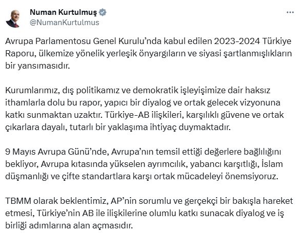 TBMM Başkanı Numan Kurtulmuş, sosyal medya hesabından yaptığı açıklamada, “Avrupa Parlamentosu Genel Kurulunda kabul edilen 2023-2024 Türkiye Raporu, ülkemize yönelik yerleşik ön yargıların ve siyasi şartlanmışlıkların bir yansımasıdır. Kurumlarımız, dış politikamız ve demokratik işleyişimize dair haksız ithamlarla dolu bu rapor, yapıcı bir diyalog ve ortak gelecek vizyonuna katkı sunmaktan uzaktır. Türkiye-AB ilişkileri, karşılıklı güvene ve ortak çıkarlara dayalı, tutarlı bir yaklaşıma ihtiyaç duymaktadır. 9 Mayıs Avrupa Gününde, Avrupanın temsil ettiği değerlere bağlılığını bekliyor, Avrupa kıtasında yükselen ayrımcılık, yabancı karşıtlığı, İslam düşmanlığı ve çifte standartlara karşı ortak mücadeleyi önemsiyoruz. TBMM olarak beklentimiz, APnin sorumlu ve gerçekçi bir bakışla hareket etmesi, Türkiyenin AB ile ilişkilerine olumlu katkı sunacak diyalog ve iş birliği adımlarına alan açmasıdır” ifadelerini kullandı.