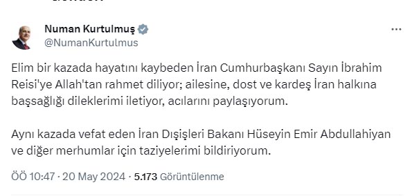 TBMM Başkanı Kurtulmuş, “Elim bir kazada hayatını kaybeden İran Cumhurbaşkanı Sayın İbrahim Reisiye Allahtan rahmet diliyor; ailesine, dost ve kardeş İran halkına başsağlığı dileklerimi iletiyor, acılarını paylaşıyorum. Aynı kazada vefat eden İran Dışişleri Bakanı Hüseyin Emir Abdullahiyan ve diğer merhumlar için taziyelerimi bildiriyorum” ifadelerini kullandı.