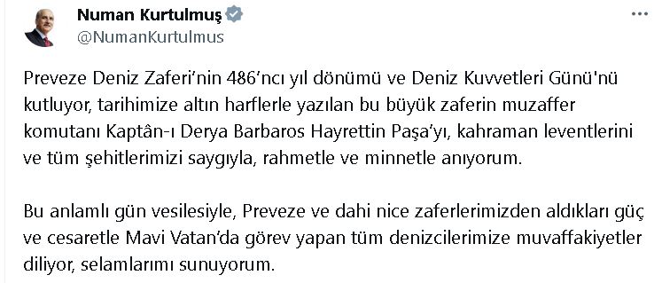 TBMM Başkanı Kurtulmuş, sosyal medya hesabından yaptığı açıklamada, “Preveze Deniz Zaferinin 486ncı yıl dönümü ve Deniz Kuvvetleri Gününü kutluyor, tarihimize altın harflerle yazılan bu büyük zaferin muzaffer komutanı Kaptan-ı Derya Barbaros Hayrettin Paşayı, kahraman leventlerini ve tüm şehitlerimizi saygıyla, rahmetle ve minnetle anıyorum. Bu anlamlı gün vesilesiyle, Preveze ve dahi nice zaferlerimizden aldıkları güç ve cesaretle Mavi Vatanda görev yapan tüm denizcilerimize muvaffakiyetler diliyor, selamlarımı sunuyorum” dedi.