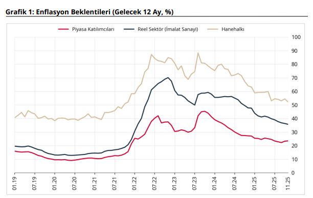 TCMB, Kasım 2025 dönemine ilişkin sektörel enflasyon beklentilerini açıkladı. Buna göre; 2025 yılı Kasım ayında 12 ay sonrası yıllık enflasyon beklentileri bir önceki aya göre, piyasa katılımcıları için 0,23 puan artarak yüzde 23,49 seviyesine yükselirken, reel sektör için 0,60 puan azalarak yüzde 35,70 seviyesine, hanehalkı için 2,15 puan azalarak yüzde 52,24 seviyesine geriledi. Gelecek 12 aylık dönemde enflasyonun düşeceğini bekleyen hanehalkı oranı bir önceki aya göre 1,67 puan azalarak yüzde 24,83 seviyesinde gerçekleşti.