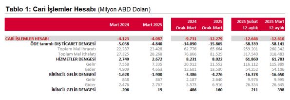 TCMB, Mart 2025 dönemine ilişkin ödemeler dengesi istatistiklerini açıkladı buna göre; mart ayında cari işlemler hesabı 4 milyar 87 milyon dolar açık kaydetti. Altın ve enerji hariç cari işlemler hesabı ise 1 milyar 471 milyon dolar fazla verdi. Ödemeler dengesi tanımlı dış ticaret açığı 4 milyar 840 milyon dolar olarak gerçekleşti. Yıllıklandırılmış verilere göre, mart ayında cari açık yaklaşık 12,6 milyar dolar olurken, ödemeler dengesi tanımlı dış ticaret dengesi de 58,1 milyar dolar açık verdi. Aynı dönemde hizmetler dengesi ile ikincil gelir dengesi sırasıyla 61,8 milyar dolar ve 398 milyon dolar fazla verirken, birincil gelir dengesi 16,7 milyar dolar açık verdi.