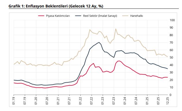 TCMB, Aralık 2025 dönemine ilişkin sektörel enflasyon beklentileri verilerini açıkladı. Buna göre; 2025 yılı Aralık ayında 12 ay sonrası yıllık enflasyon beklentileri bir önceki aya göre piyasa katılımcıları için 0,14 puan azalarak yüzde 23,35 seviyesine, reel sektör için 0,90 puan azalarak yüzde 34,80 seviyesine, hanehalkı için 1,34 puan azalarak yüzde 50,90 seviyesine geriledi. Gelecek 12 aylık dönemde enflasyonun düşeceğini bekleyen hanehalkı oranı bir önceki aya göre 0,30 puan azalarak yüzde 24,53 seviyesinde gerçekleşti.