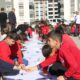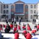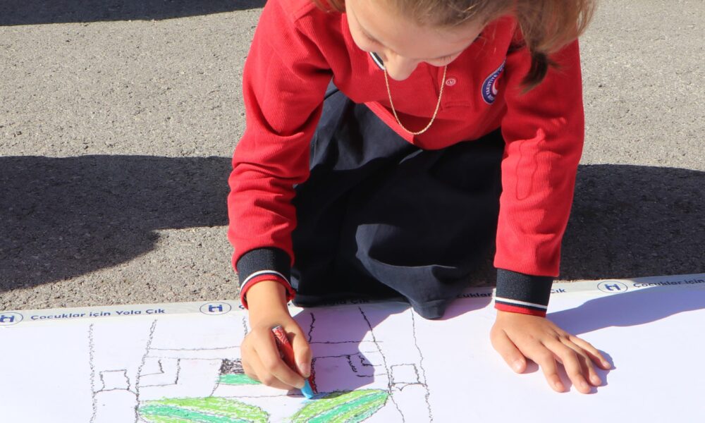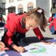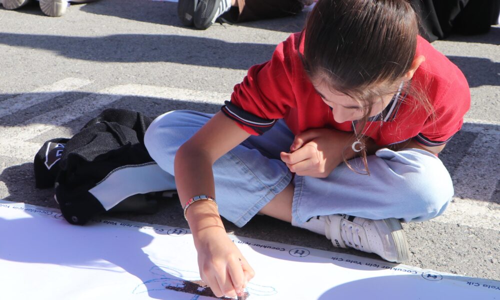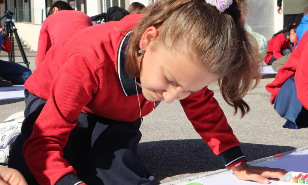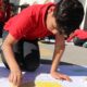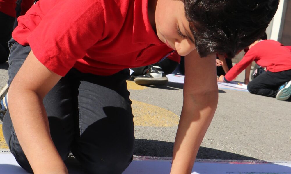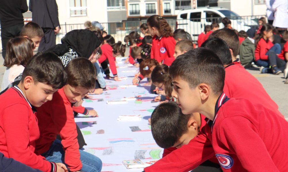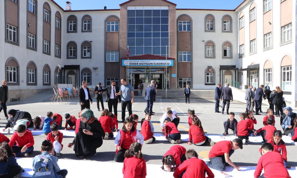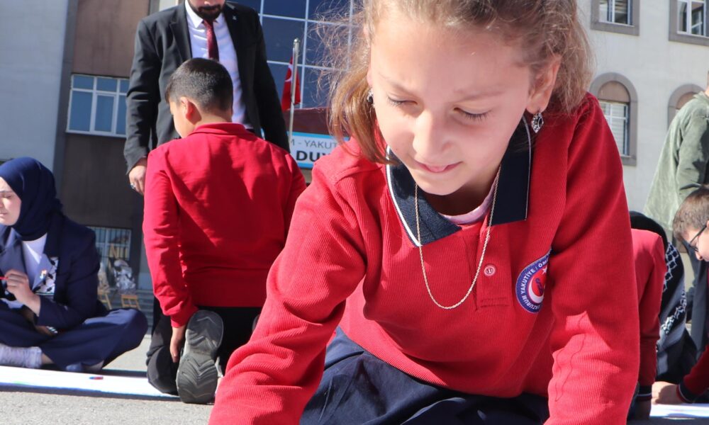 Erzurum Ömer Duygun İlkokulu'nda düzenlenen 'Filistin Farkındalık Etkinliği'nde öğrenciler bahçeye serilen tuvale resimler çizdi yazılar yazdı. Fotoğraf: Salih TEKİN / Erzurum,(DHA)