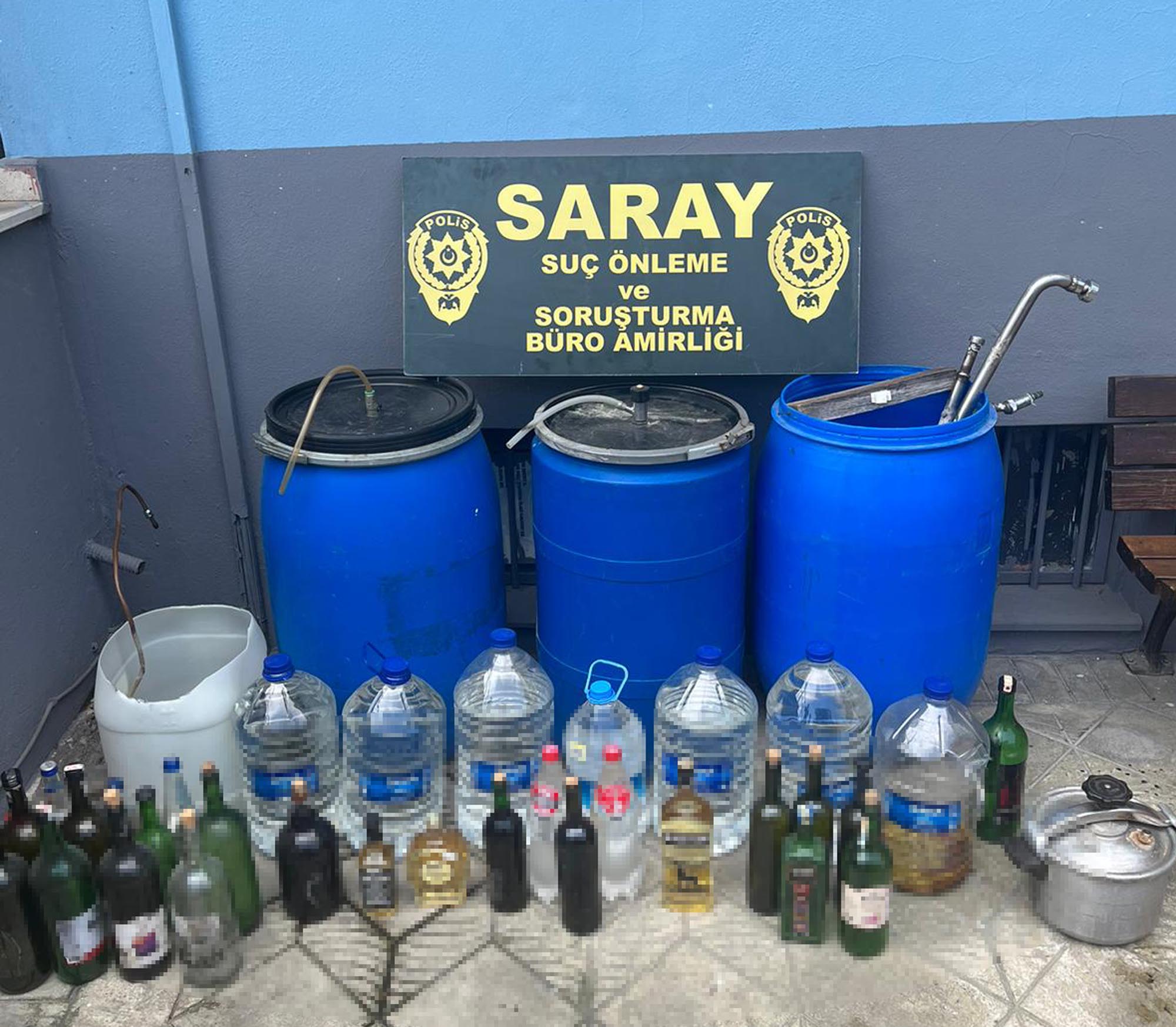 Saray Emniyet Müdürlüğü Suç Önleme ve Soruşturma Büro Amirliği ekipleri, M.M.nin evinde sahte içki üretimi yaptığı bilgisine ulaştı. Evde yapılan aramada sahte 115 litre şarap, 59 litre rakı ile birlikte damıtma işleminde kullanılan 3 düzenek ele geçirildi. Sahte içkilere el konuldu, gözaltına alınan M.M. hakkında yasal işlem başlatıldı.