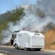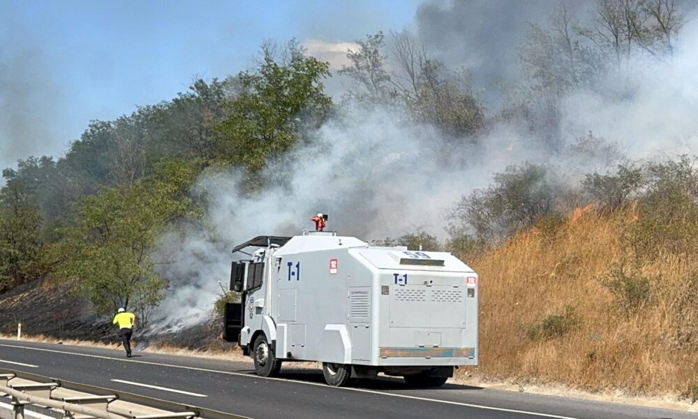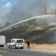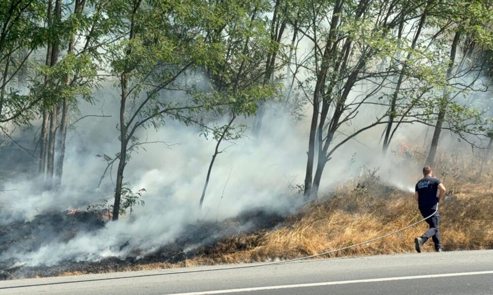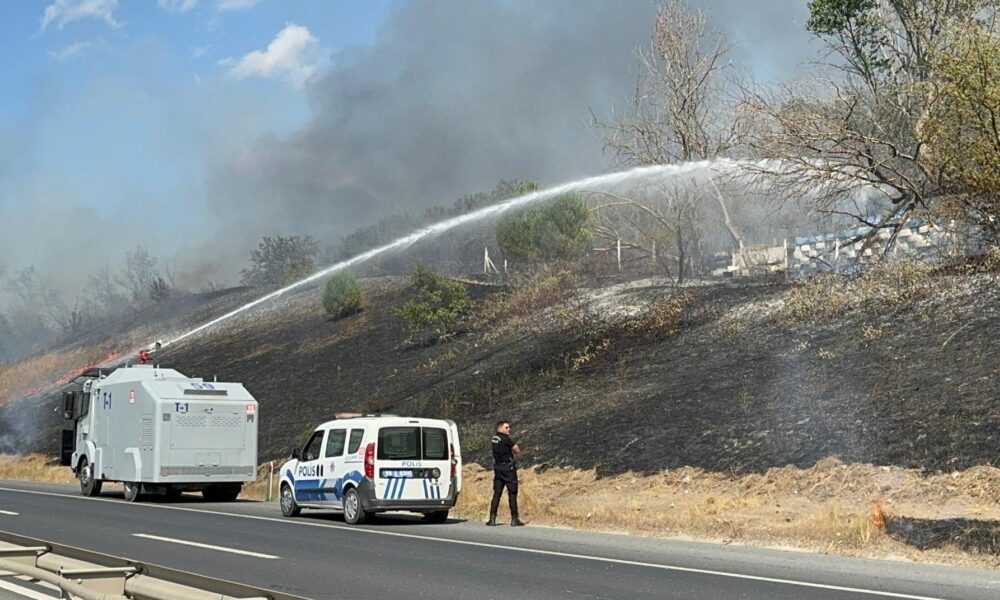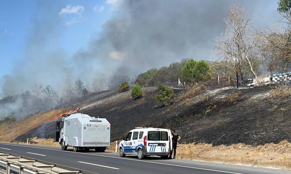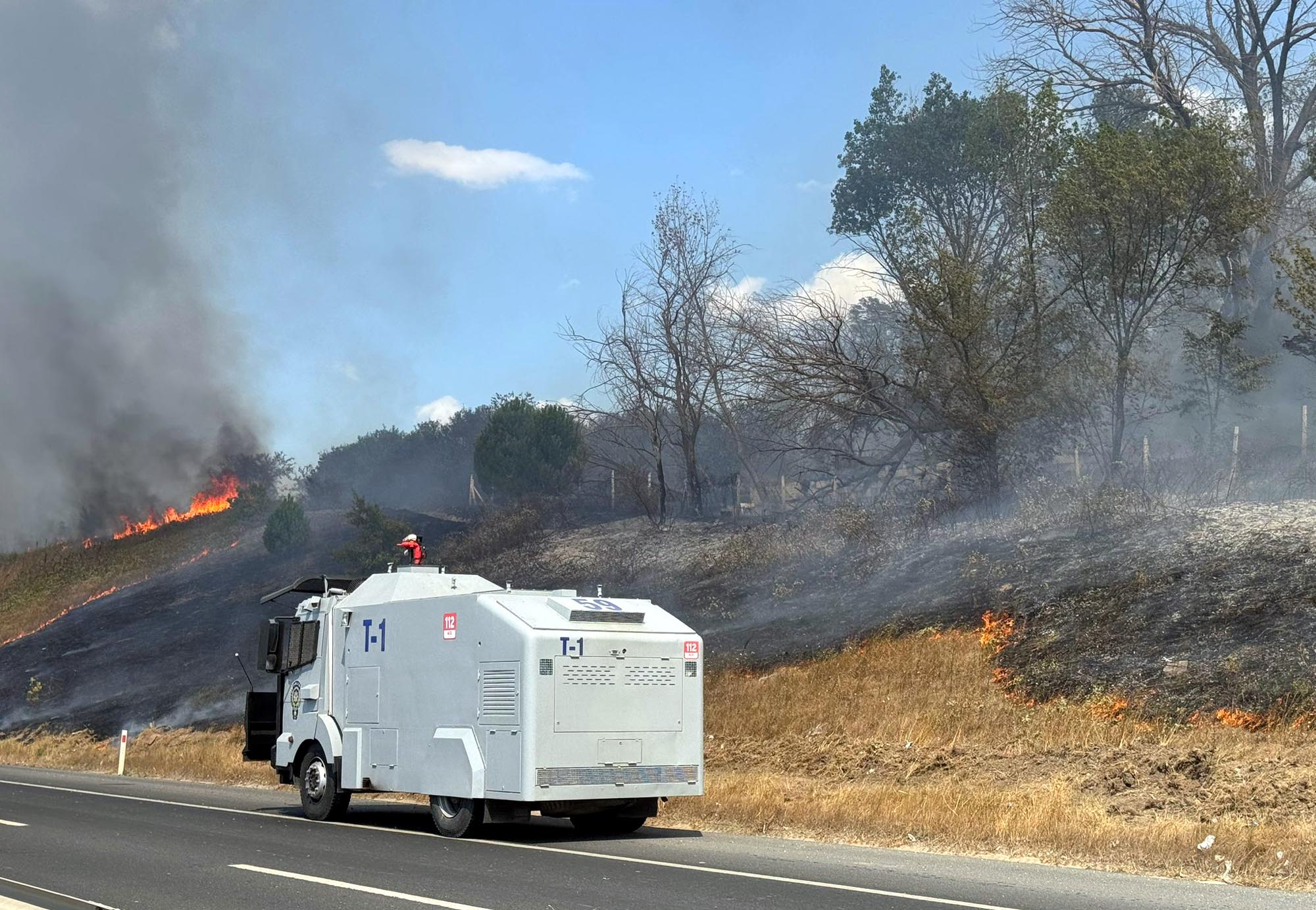 Tekirdağ'ın Ergene ilçesinde biçilmiş buğday tarlasında başlayan yangında alevler, palet ve geri dönüşüm fabrikasına sıçradı. İtfaiye ekiplerine takviye olarak polisin TOMA araçları da bölgeye yönlendirildi. Yangından kaçan çekirgeler kara yoluna çıktı. F