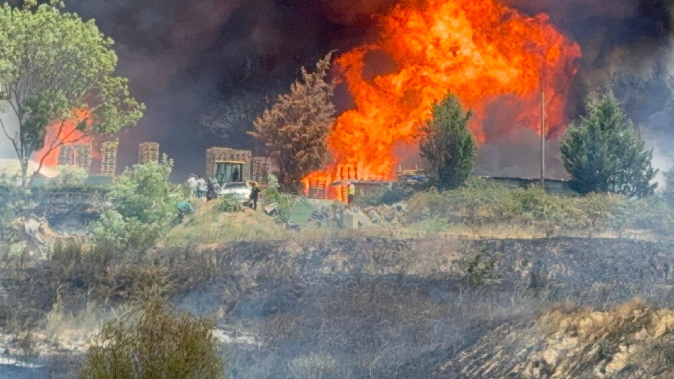 • Tekirdağ'ın Ergene ilçesinde biçilmiş buğday tarlasında başlayan yangında alevler, palet ve geri dönüşüm fabrikasına sıçradı. İtfaiye ekipleri yangını söndürmek için çalışmalarını sürdürüyor. Fotoğraf: Mehmet YİRUN / Ergene (Tekirdağ), (DHA)