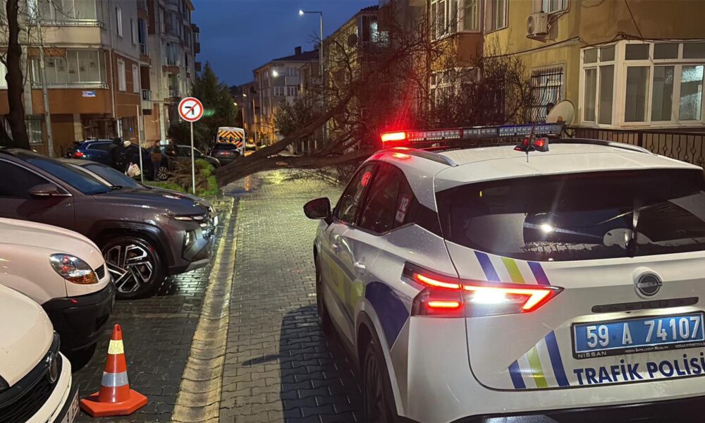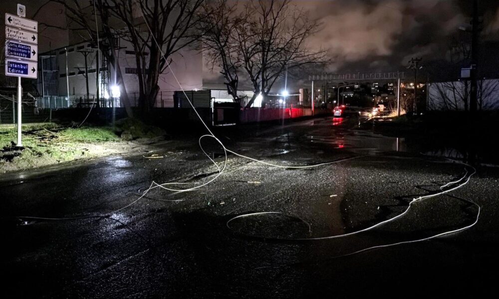 Tekirdağ'ın Çorlu ilçesinde etkili olan fırtınada ağaçlar devrildi, elektrik telleri koptu. Polis, tellerin koptuğu bölgede önlem alıp, sürücüleri uyardı. Fotoğraf: Mehmetcan ARSLAN/Tekirdağ, (DHA)