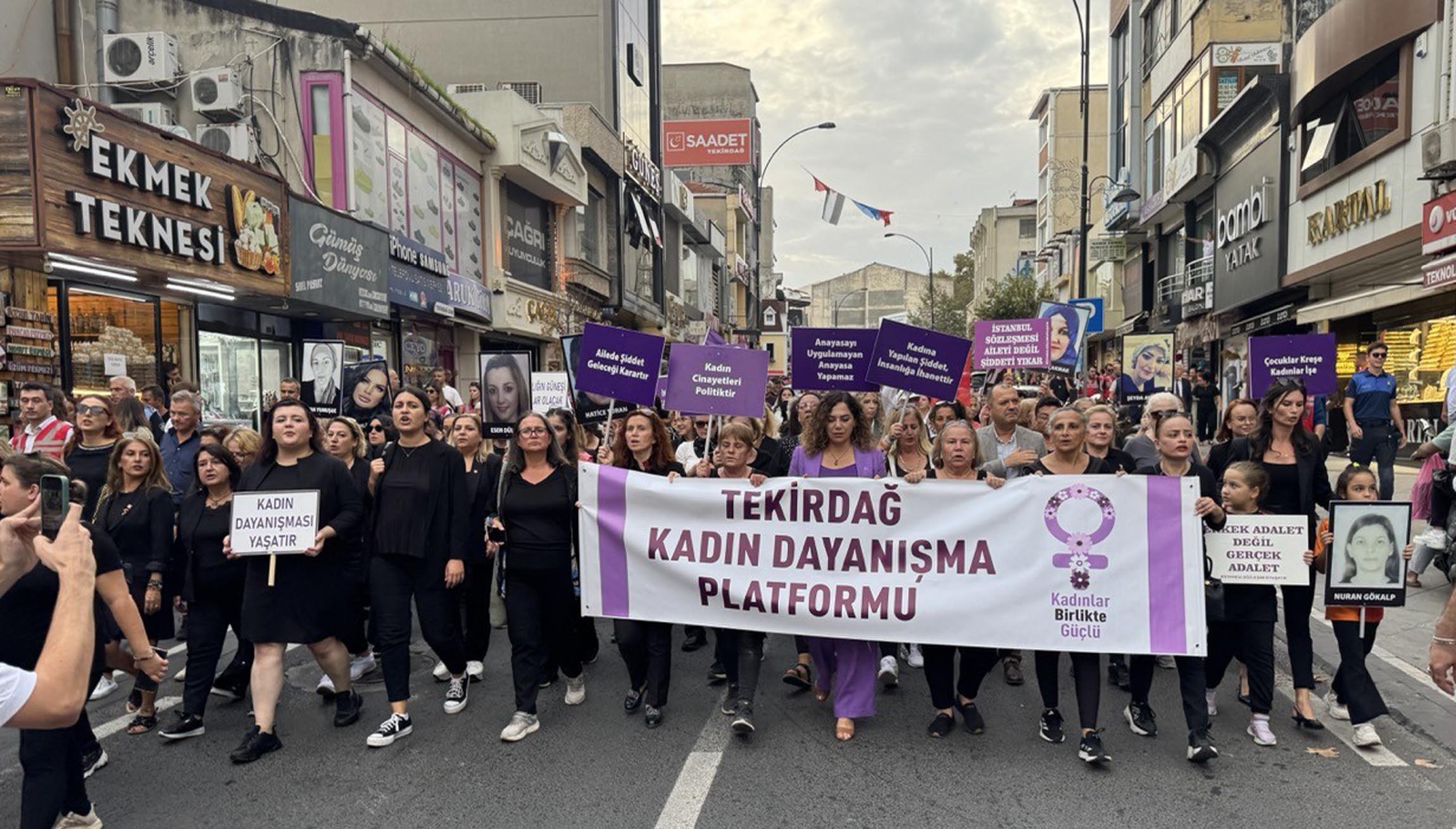 Tekirdağ Kadın Platformu, kadınlara yönelik şiddeti protesto etmek için yürüyüş düzenledi. Tekirdağlı kadınların siyah giydiği yürüyüşe, Büyükşehir Belediye Başkanı Candan Yüceer, CHP Tekirdağ Milletvekili İlhami Özcan Aygun de katıldı. Süleymanpaşa ilçesi Hükümet Caddesi üzerinde yürüyen kadınlara çevrede bulunanlar da destek verdi.