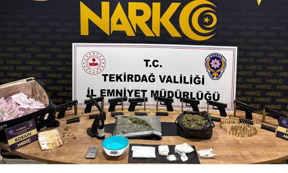 İl Emniyet Müdürlüğü Narkotik Suçlarla Mücadele Şube Müdürlüğü ekipleri, Çorlunun Rumeli ve Hürriyet mahallelerinde uyuşturucu ve silah kaçakçılığı yapıldığı ihbarıyla harekete geçti. Çorlu Cumhuriyet Başsavcılığının talimatıyla ekipler, belirlenen 3 adrese eş zamanlı operasyon yaptı. Adreslerdeki aramalarda 873 gram esrar, 320 gram kokain, 2 hassas terazi, 910 bin lira değerinde para, döviz ve altın ile karton kutuda 9 ruhsatsız tabanca ve mermiler ele geçirildi. Gözaltına alınan A.J.T. ve Y.C.A., işlemlerinin ardından sevk edildikleri adliyede çıkarıldığı mahkemede, Uyuşturucu ve silah ticareti yapma suçundan tutuklandı.