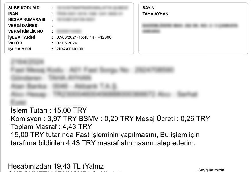 Ayhan, verilen numarayı aradığında kendisini avukat olarak tanıtan kadın, “Türkiyede yasal olmayan yasa dışı bahis sitelerine üyelik işlemleri gerçekleştirmişsiniz. Sizlerin WhatsApp tespitleri yapılmış, Adalet Bakanlığı talimatıyla tarafınıza 38 bin 750 TL adli para cezai işlemi sağlanmış. Dosyanızın adli onaydan geçmesine 15 dakikalık bir süreç kalmış. Sizlerin mağduriyeti var. Adli onaydan geçtikten sonra tarafınıza tebligat gönderilir. Daha sonra soruşturmalara katılım sağlayacaksınız, 2 ila 4 yıl arasında yargılanma süreci vardır. Bunun ödemesini zaten Vergi Dairesinden yapıyorsunuz, 38 bin 750 TLyi. Ancak daha önceden böyle bir suç kaydınız bulunmadığından dolayı yüzde 40 indiriminiz bulunuyor, bu da 15 bin 500 TLye tekabül eder” dedi. Durumu fark eden Ayhan, verilen banka hesabına 15 bin 500 yerine 15 lira gönderdi. Tekrar arayan kadın, gönderilen ücretin az olduğunu söyleyip, tepki göstererek, telefonu kapattı. Kadının aradığı numaraya daha sonra ulaşılamadı.