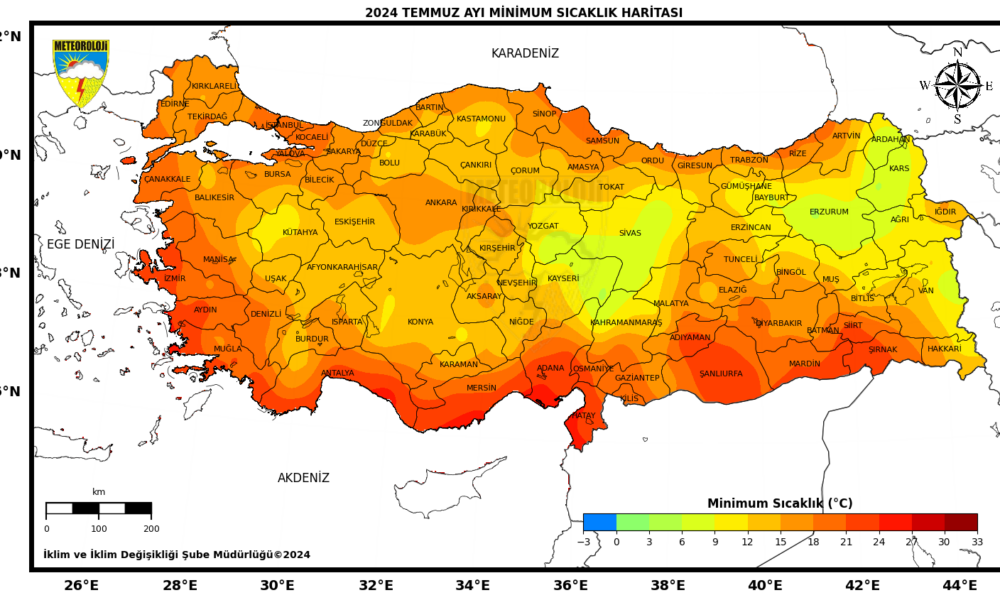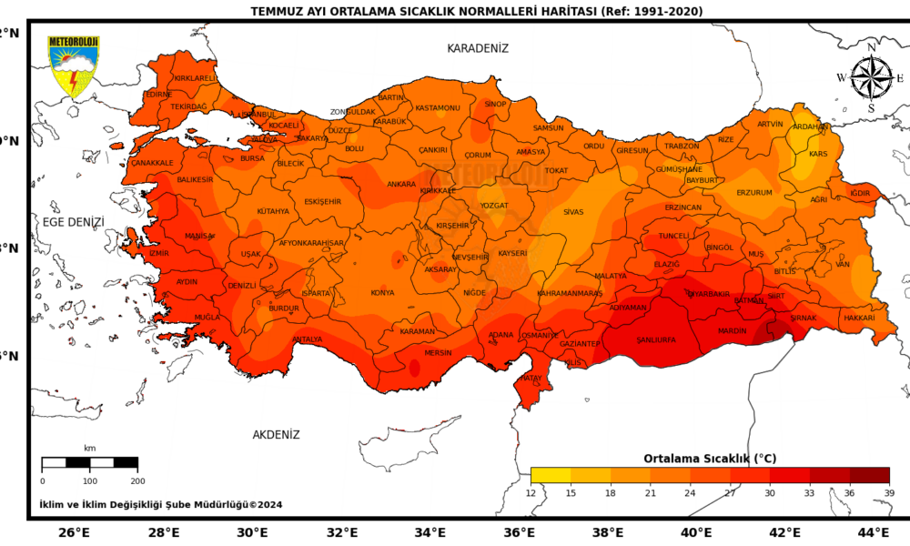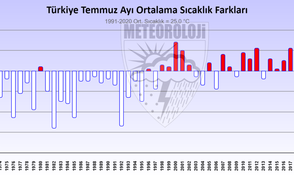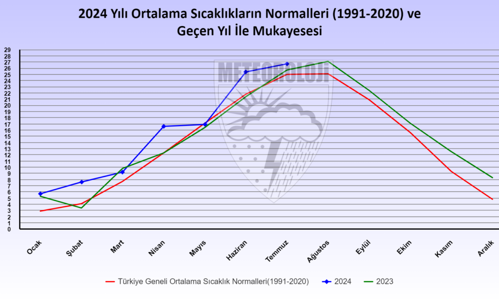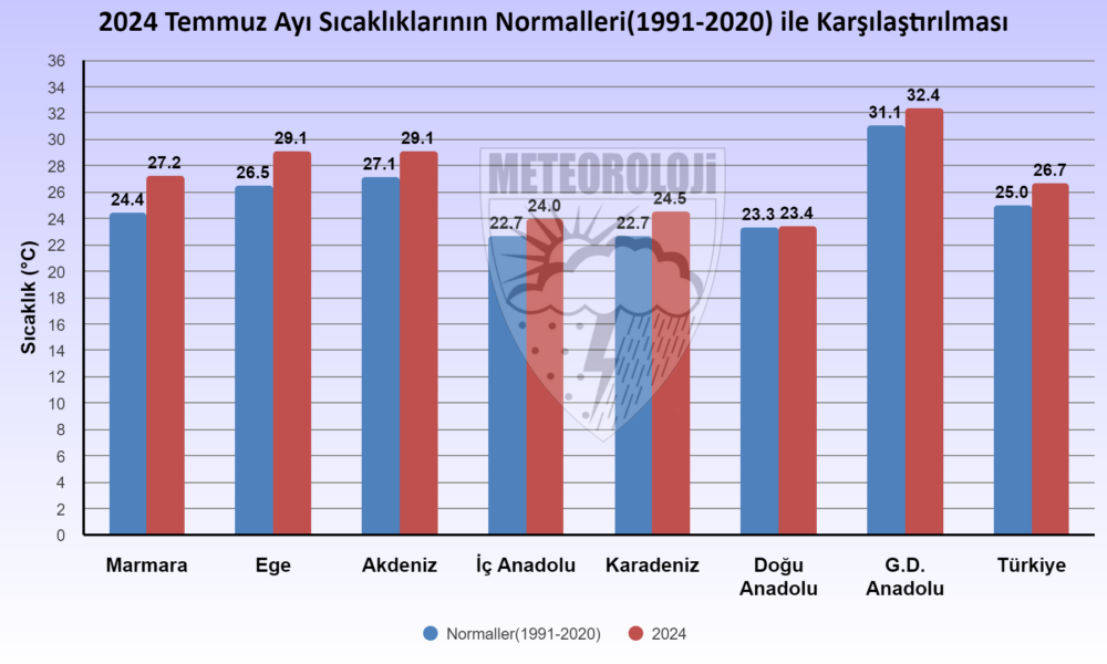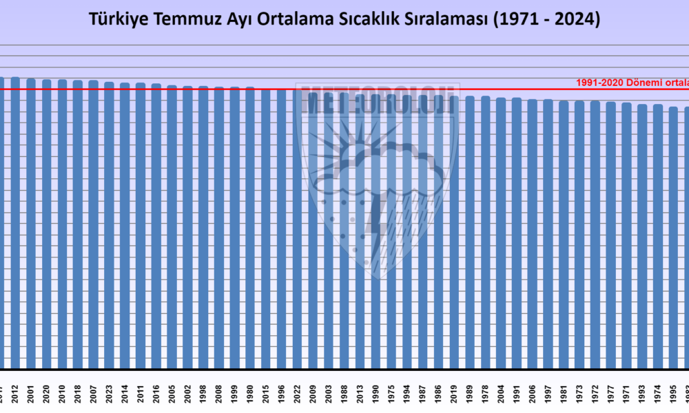 MGM, 2024 yılı temmuz ayına ait Ortalama Sıcaklık Raporu verilerini yayınladı. Buna göre; 2024 yılı temmuz ayında ortalama sıcaklıklar, İspir, Oltu, Doğubeyazıt çevrelerinde mevsim normallerinin altında; Emirdağ, Göksun, Tefenni, Korkuteli, Sivas, Ankara, Kırıkkale, Yozgat, Kırşehir, Nevşehir, Konya, Karaman, Niğde, Kayseri, Artvin, Gümüşhane, Bayburt, Şebinkarahisar, Doğu Anadolu Bölgesinin genelinde, Siirt, Mardin, Diyarbakır, Batman, Cizre, Birecik çevrelerinde mevsim normalleri civarında gerçekleşirken; yurdun diğer bölgelerinde mevsim normallerinin üzerinde gerçekleşti. 1991- 2020 normalleri temmuz ayı ortalama sıcaklığı 25 santigrat derece olup 2024 yılı temmuz ayı sıcaklığı ise 26,7 santigrat derece ile normallerinin 1,7 santigrat derece üzerinde gerçekleşti. 2024 yılı temmuz ayı, son 53 yılın en sıcak temmuz ayı olarak kayıtlara geçti. Temmuz ayında en düşük sıcaklık 5,2 santigrat derece ile Erzurumda, en yüksek sıcaklık ise 45,9 santigrat derece ile Cizrede tespit edildi. 2024 yılı temmuz ayı ortalama minimum sıcaklıkları 1991- 2020 minimum sıcaklık normallerinin 2,4 santigrat derece üzerinde gerçekleşti. 2024 yılı temmuz ayı ortalama maksimum sıcaklıkları, 1991- 2020 maksimum sıcaklık normallerinin 0,7 santigrat derece üzerinde gerçekleşti.