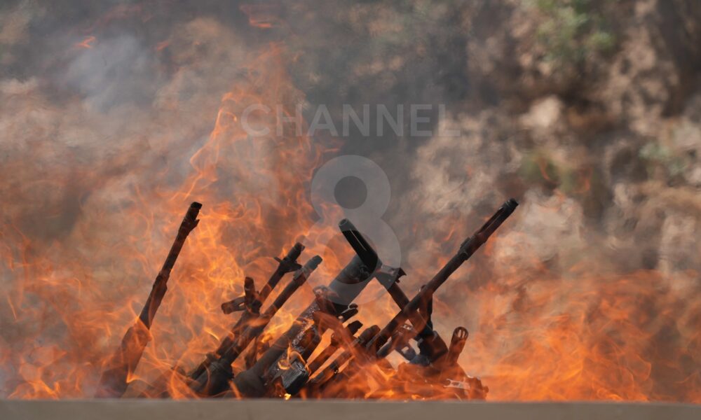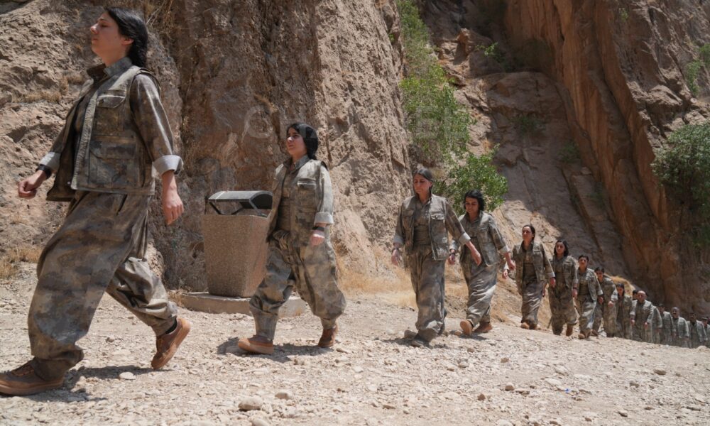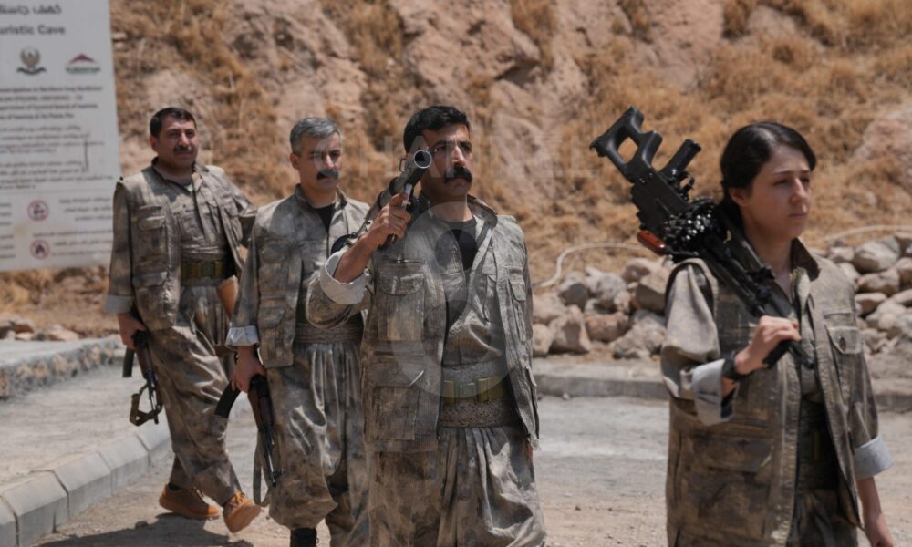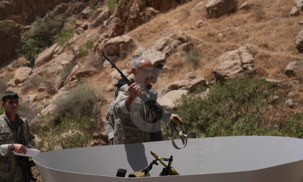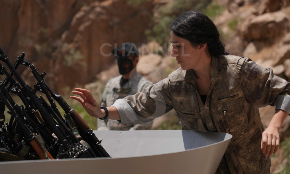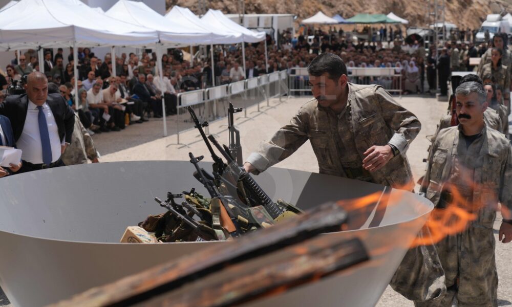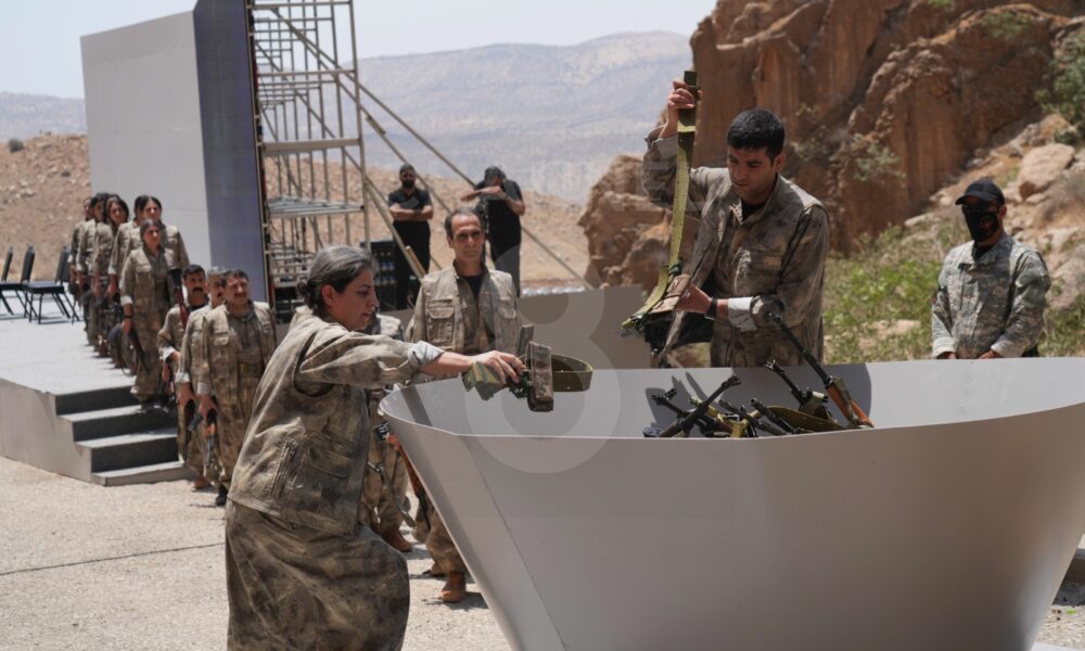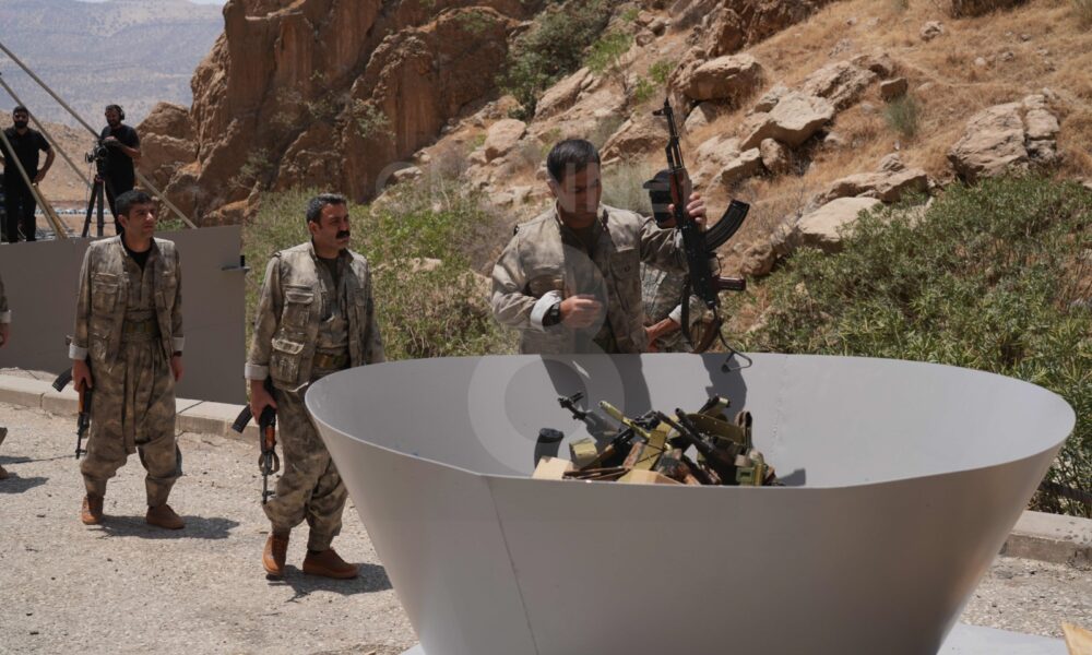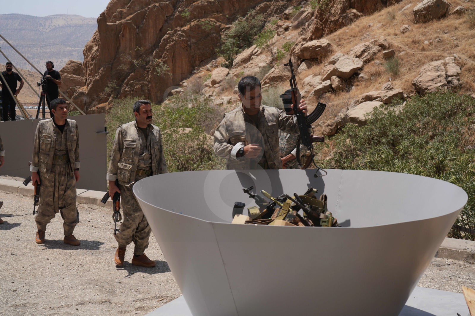 Terör örgütü PKK mensubu grup, Irakın Süleymaniye kenti yolu üzerinde bulunan Jasena Dağı eteklerinde belirlenen alana geldi. PKKnın sözde üst düzey yöneticisi Bese Hozatın da bulunduğu 15i kadın, 15i erkek 30 terör örgütü üyesi, tek tek silahlarını kazan şeklindeki metalin içine bıraktı. Daha sonra silahlar ateşe verilip, imha edildi. Silahların imha edildiği alanın çevresinde geniş güvenlik önlemi alındı, bir helikopter havadan alanın etrafında sürekli tarama yaptı.