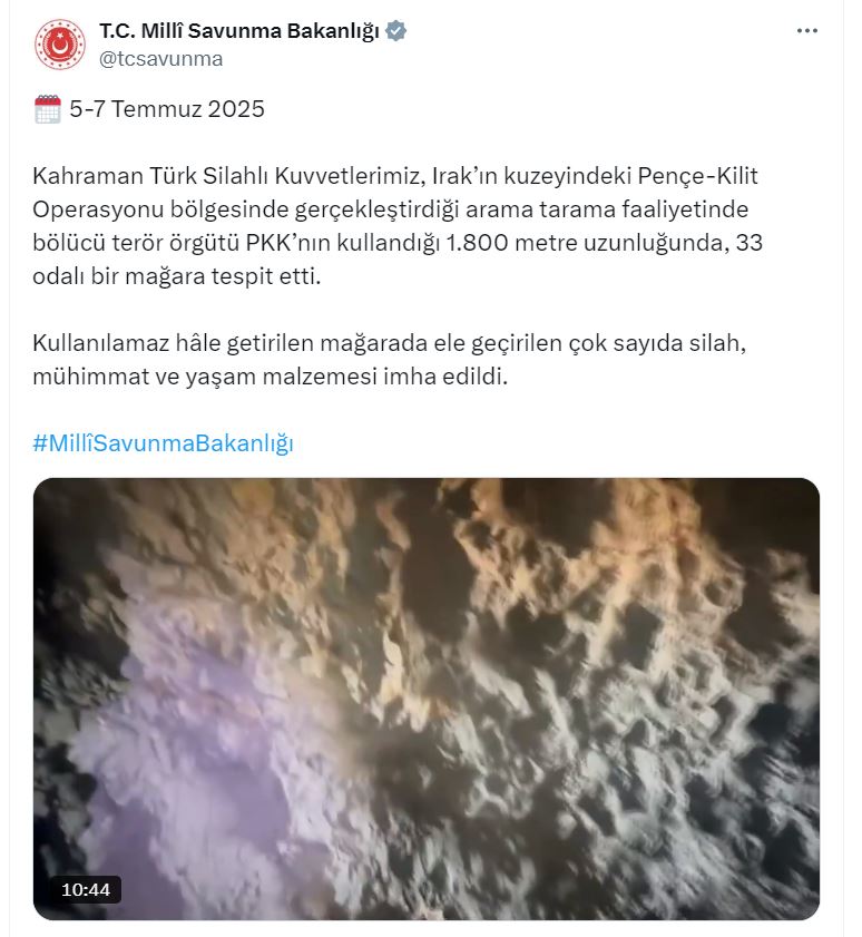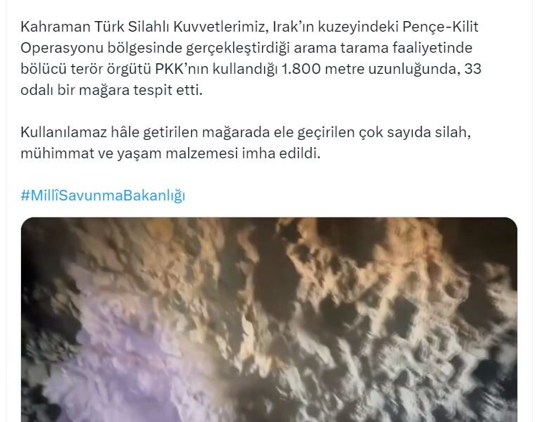 Bakanlığın sosyal medya hesabından yapılan açıklamaya göre; Türk Silahlı Kuvvetleri, Irakın kuzeyindeki Pençe-Kilit Operasyonu bölgesinde gerçekleştirdiği arama tarama faaliyetinde bölücü terör örgütü PKKnın kullandığı 1800 metre uzunluğunda, 33 odalı bir mağara tespit etti. Kullanılamaz hale getirilen mağarada ele geçirilen çok sayıda silah, mühimmat ve yaşam malzemesi imha edildi.