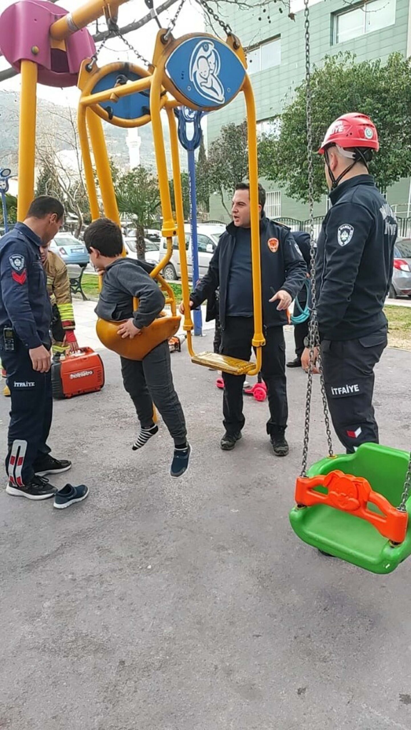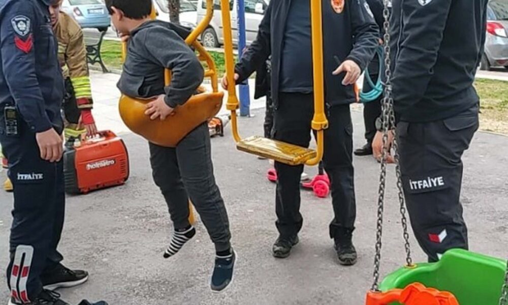 Ters oturduğu salıncakta sıkışan çocuğu itfaiye kurtardı