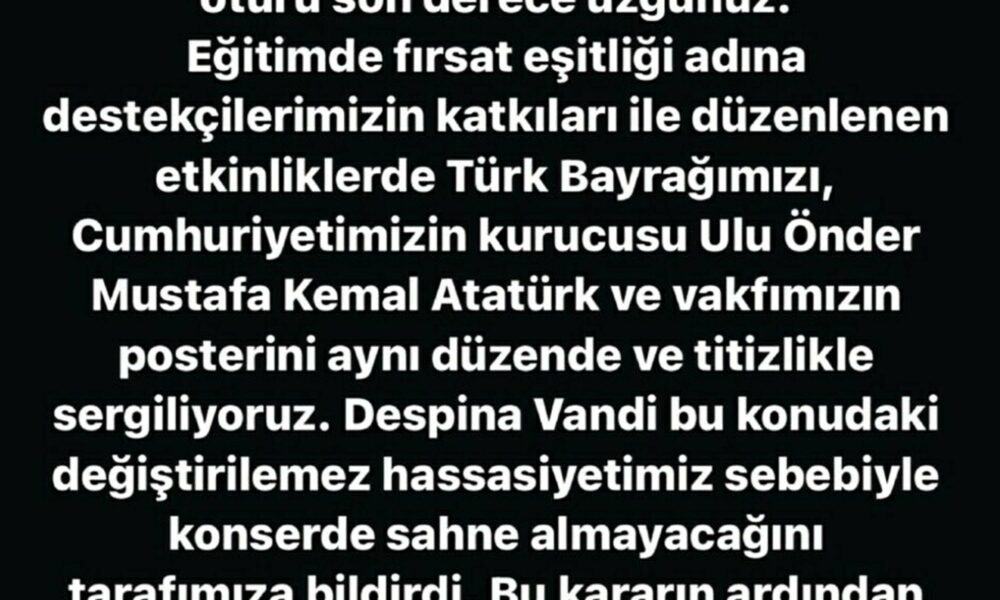 Konuyla ilgili Türk Eğitim Vakfının (TEV) sosyal medya hesabından yapılan açıklamada ise “17 Temmuz akşamı İzmir Çeşmede sanatçı Despina Vandinin sahne almasını planladığımız yardım konserinde, dahlimiz olmayan şekilde yaşananlardan ötürü son derece üzgünüz. Eğitimde fırsat eşitliği adına destekçilerimizin katkıları ile düzenlenen etkinliklerde Türk bayrağımızı, Cumhuriyetimizin kurucusu Ulu Önder Mustafa Kemal Atatürk ve vakfımızın posterini aynı düzende ve titizlikle sergiliyoruz. Despina Vandi bu konudaki değiştirilmez hassasiyetimiz sebebiyle konserde sahne almayacağını tarafımıza bildirdi. Bu kararın ardından iki komşu ülkenin sanatının icra edildiği güzel bir gece olmasını hayal ettiğimiz konserimizde yaşananlardan dolayı üzgün olduğumuzu kamuoyunun bilgisine sunuyor, yanımızda olan tüm misafir ve bağışçılarımıza teşekkür ediyoruz” denildi.