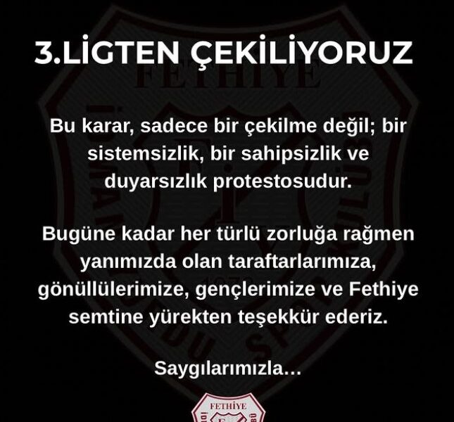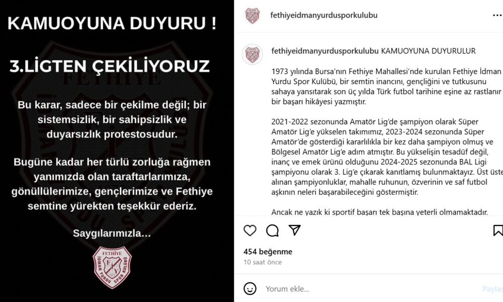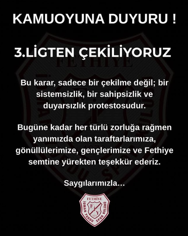 2024-2025 sezonunda Bölgesel Amatör Lig 8’inci Grup’ta şampiyon olarak TFF 3’üncü Lig’e yükselen Bursa temsilcisi Fethiye İdman Yurdu Spor Kulübü, sosyal medya hesabından ligden çekilme kararı aldığını duyurdu. Kararın, sistemsizlik, sahipsizlik ve duyarsızlık protestosu olduğu belirtilen açıklamada, “1973 yılında Bursa’nın Fethiye Mahallesi’nde kurulan Fethiye İdman Yurdu Spor Kulübü, bir semtin inancını, gençliğini ve tutkusunu sahaya yansıtarak son üç yılda Türk futbol tarihine eşine az rastlanır bir başarı hikayesi yazmıştır. 2021-2022 sezonunda Amatör Lig’de şampiyon olarak Süper Amatör Lig’e yükselen takımımız, 2023-2024 sezonunda Süper Amatör’de gösterdiği kararlılıkla bir kez daha şampiyon olmuş ve Bölgesel Amatör Lig’e adım atmıştır. Bu yükselişin tesadüf değil, inanç ve emek ürünü olduğunu 2024-2025 sezonunda BAL Ligi şampiyonu olarak 3. Lig’e çıkarak kanıtlamış bulunmaktayız. Üst üste alınan şampiyonluklar, mahalle ruhunun, özverinin ve saf futbol aşkının neleri başarabileceğini göstermiştir. Ancak ne yazık ki sportif başarı tek başına yeterli olmamaktadır. Ülkemizde profesyonel liglerde mücadele edebilmek, sadece futbolcu teriyle değil; güçlü bir altyapı, sağlam bir ulaşım ağı, sürdürülebilir maddi kaynaklar ve en önemlisi yerel yönetimlerin desteğiyle mümkündür. Bizler, bu zorlu yolda daha ileriye gidebilmek için elimizden geleni yaptık. Defalarca kez Bursa Büyükşehir Belediyesi’ne, Nilüfer Belediyesi’ne ve ilgili bakanlıklarımıza ulaşarak tesis, kulübümüze tahsis edilmiş bir otobüs ve genel destek taleplerimizi ilettik. Her görüşmemizde yaptıklarımızı, hedeflerimizi, kimseden lüks değil, sadece eşitlik ve adalet beklediğimizi dile getirdik.