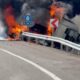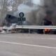 TIR devrildi, üzerindeki iş makinesi alev aldı; 3 yaralı