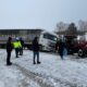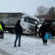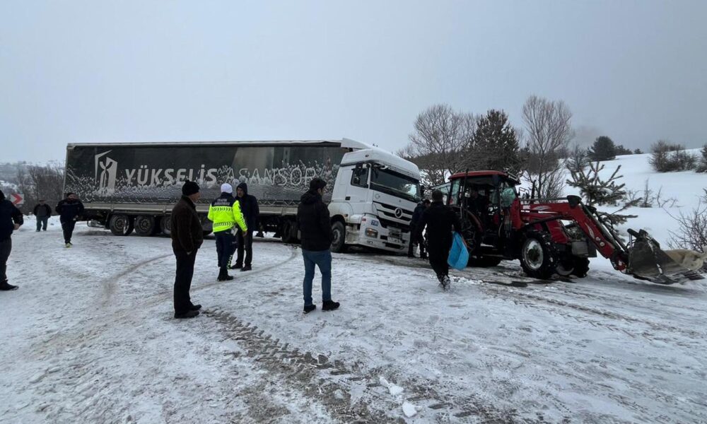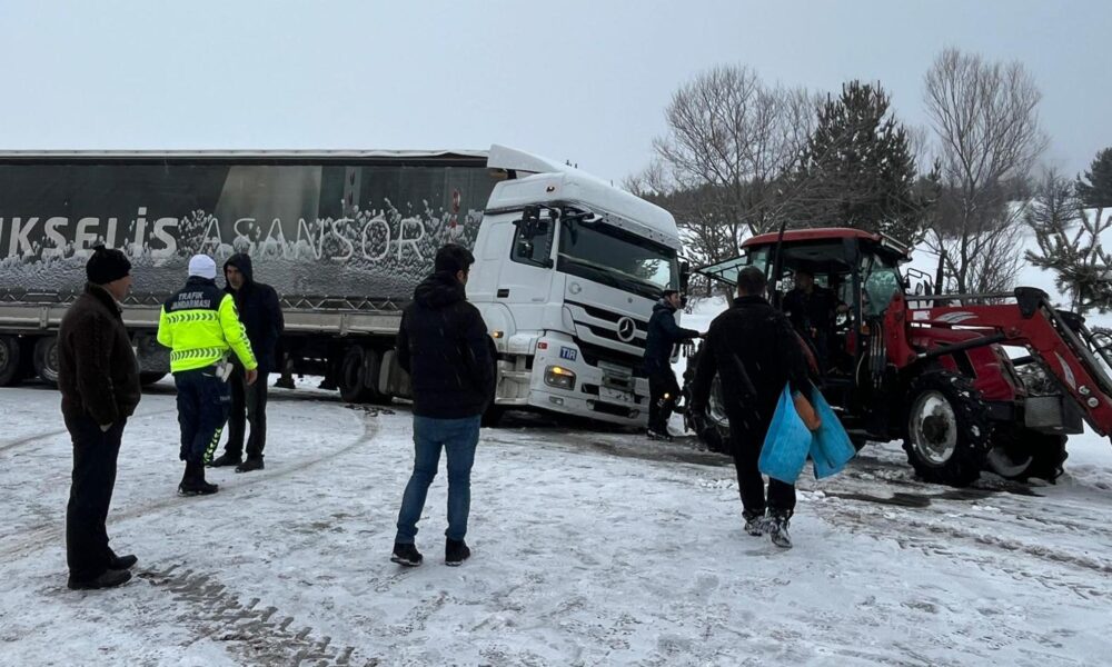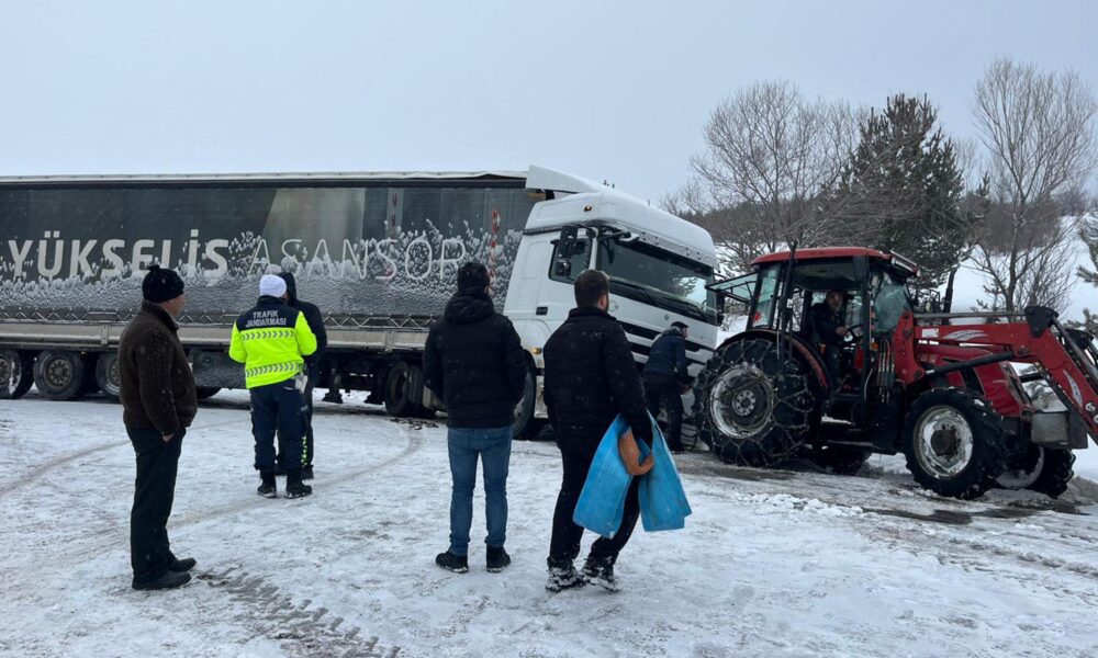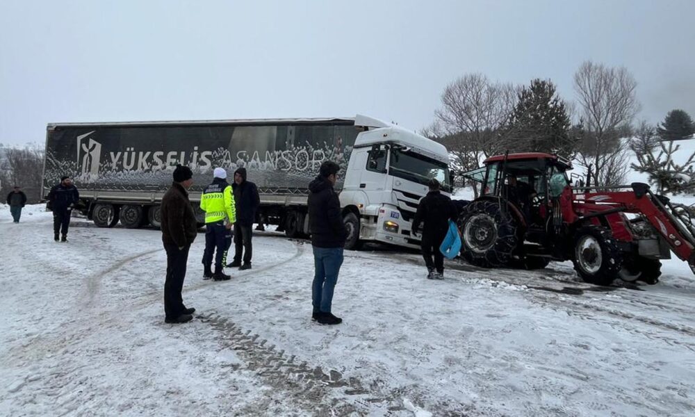 Ardahan’ın Posof ilçesinde kayan TIR, Posof Türkgözü uluslararası karayolunu ulaşıma kapattı. TIR’ı kurtarma çalışması başlatılırken, bölgede uzun araç kuyrukları oluştu. Fotoğraf: Alper TURGUT/Posof(Ardahan),(DHA)