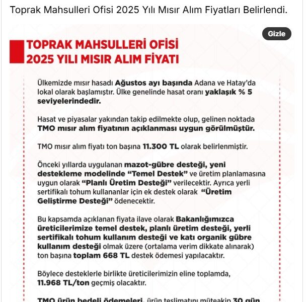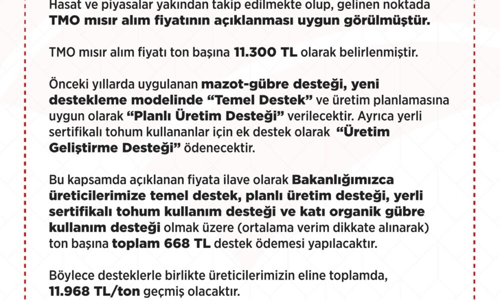 Bakanlığın Next Sosyal hesabından yapılan açıklamada, “Ülkemizde mısır hasadı ağustos ayı başında Adana ve Hatayda lokal olarak başlamıştır. Ülke genelinde hasat oranı yaklaşık yüzde 5 seviyelerindedir. Hasat ve piyasalar yakından takip edilmekte olup, gelinen noktada TMO mısır alım fiyatının açıklanması uygun görülmüştür. TMO mısır alım fiyatı, ton başına 11 bin 300 TL olarak belirlenmiştir. Önceki yıllarda uygulanan mazot-gübre desteği, yeni destekleme modelinde Temel Destek ve üretim planlamasına uygun olarak Planlı Üretim Desteği verilecektir. Ayrıca yerli sertifikalı tohum kullananlar için ek destek olarak Üretim Geliştirme Desteği ödenecektir. Bu kapsamda açıklanan fiyata ilave olarak, bakanlığımızca üreticilerimize temel destek, planlı üretim desteği, yerli sertifikalı tohum kullanım desteği ve katı organik gübre kullanım desteği olmak üzere (ortalama verim dikkate alınarak) ton başına toplam 668 TL destek ödemesi yapılacaktır. Böylece desteklerle birlikte üreticilerimizin eline toplamda, 11 bin 968 TL/ton geçmiş olacaktır. TMO ürün bedeli ödemeleri, ürün teslimatını müteakip 30 gün içerisinde üreticilerin banka hesaplarına yapılacaktır. Tüm üreticilerimize hayırlı ve bereketli bir hasat sezonu diliyoruz” ifadelerine yer verildi.