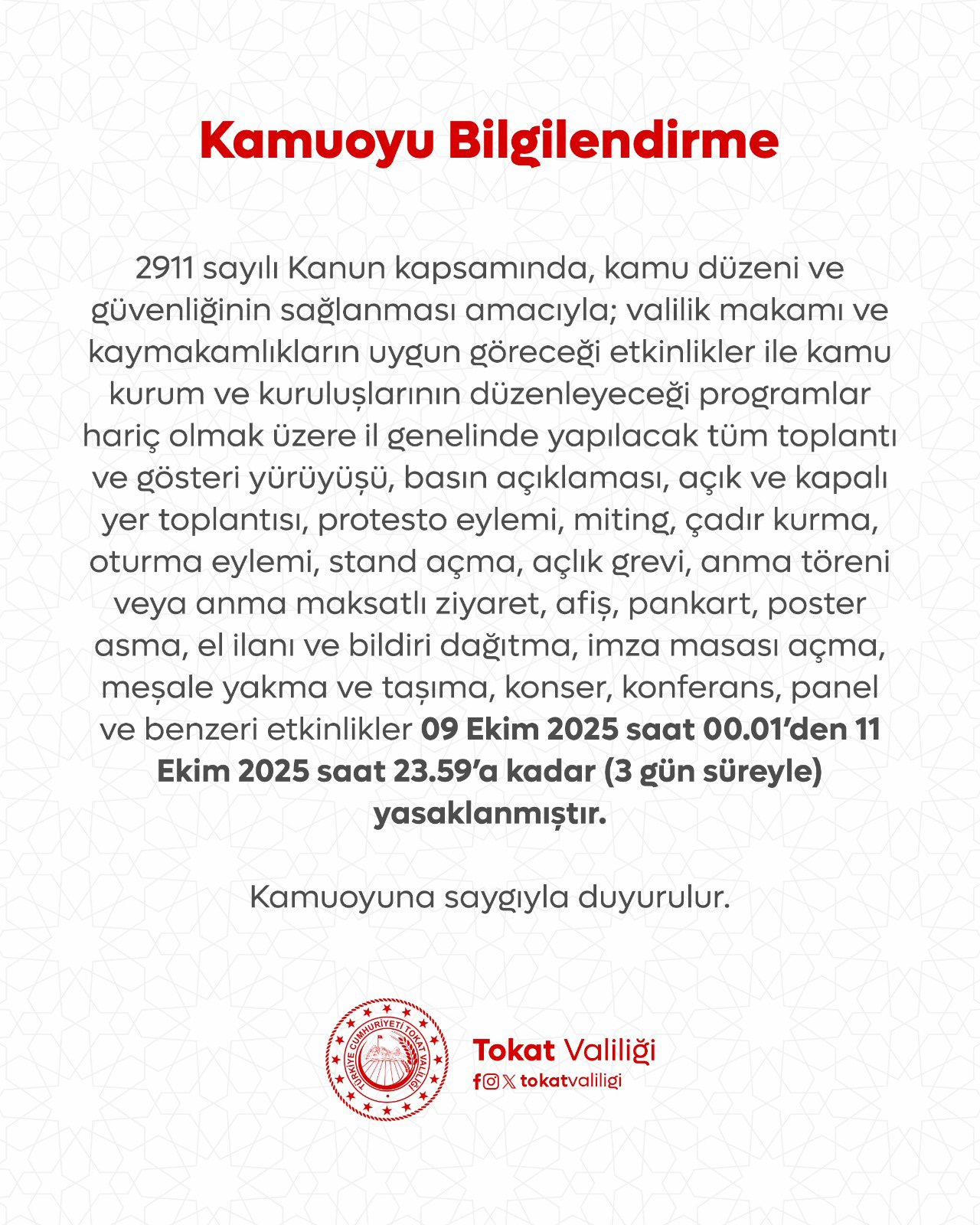 Tokat Valiliğinden yapılan açıklamada “2911 sayılı Kanun kapsamında, kamu düzeni ve güvenliğinin sağlanması amacıyla; valilik makamı ve kaymakamlıkların uygun göreceği etkinlikler ile kamu kurum ve kuruluşlarının düzenleyeceği programlar hariç olmak üzere il genelinde yapılacak tüm toplantı ve gösteri yürüyüşü, basın açıklaması, açık ve kapalı yer toplantısı, protesto eylemi, miting, çadır kurma, oturma eylemi, stant açma, açlık grevi, anma töreni veya anma maksatlı ziyaret, afiş, pankart, poster asma, el ilanı ve bildiri dağıtma, imza masası açma, meşale yakma ve taşıma, konser, konferans, panel ve benzeri etkinlikler 09 Ekim 2025 saat 00.01’den 11 Ekim 2025 saat 23.59’a kadar (3 gün süreyle) yasaklanmıştır” denildi.