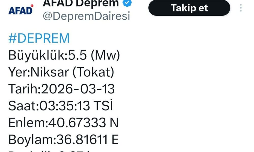 Afet ve Acil Durum Yönetimi Başkanlığı (AFAD) verilerine göre; saat 03.35’te merkez üssü Tokat’ın Niksar ilçesinde 5,5 büyüklüğünde deprem kaydedildi. Yerin 6,37 kilometre derinliğinde meydana gelen deprem Tokat ve ilçelerinin yanı sıra Samsun, Amasya, Ordu ve Sivas illerinden de hissedildi. Merkez üssü Niksar’da depreme uykularında yakalanan vatandaşlar panik ve korku içerisinde evlerinden dışarıya çıktı.