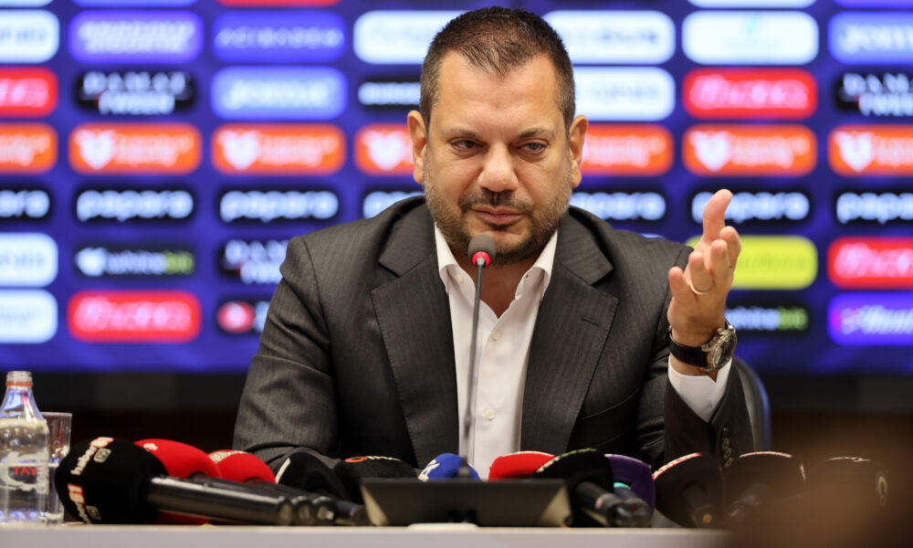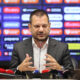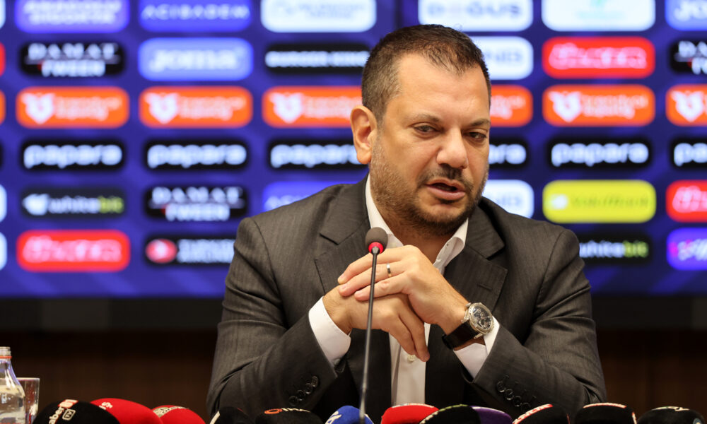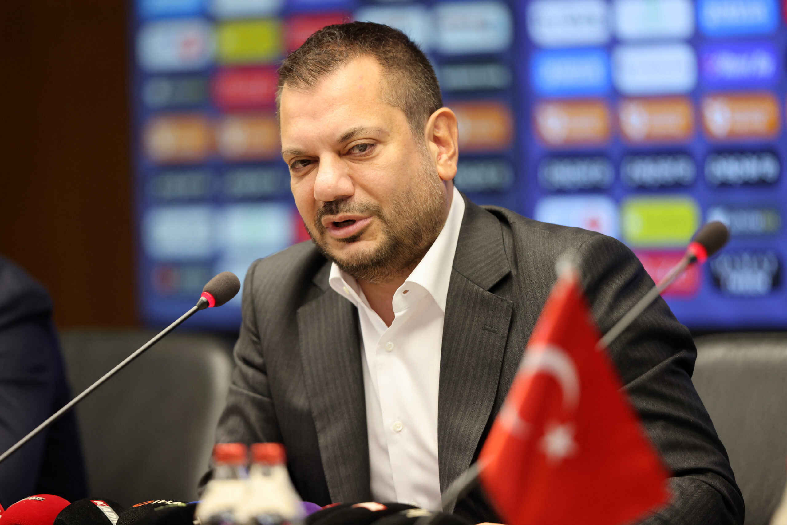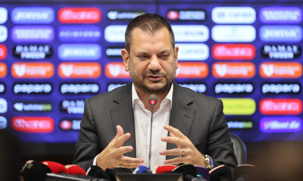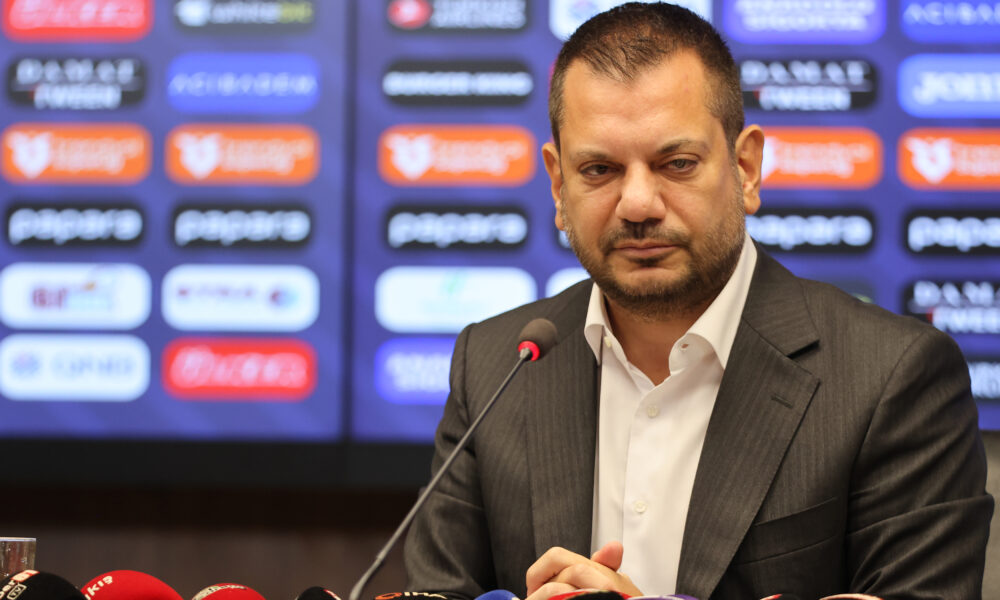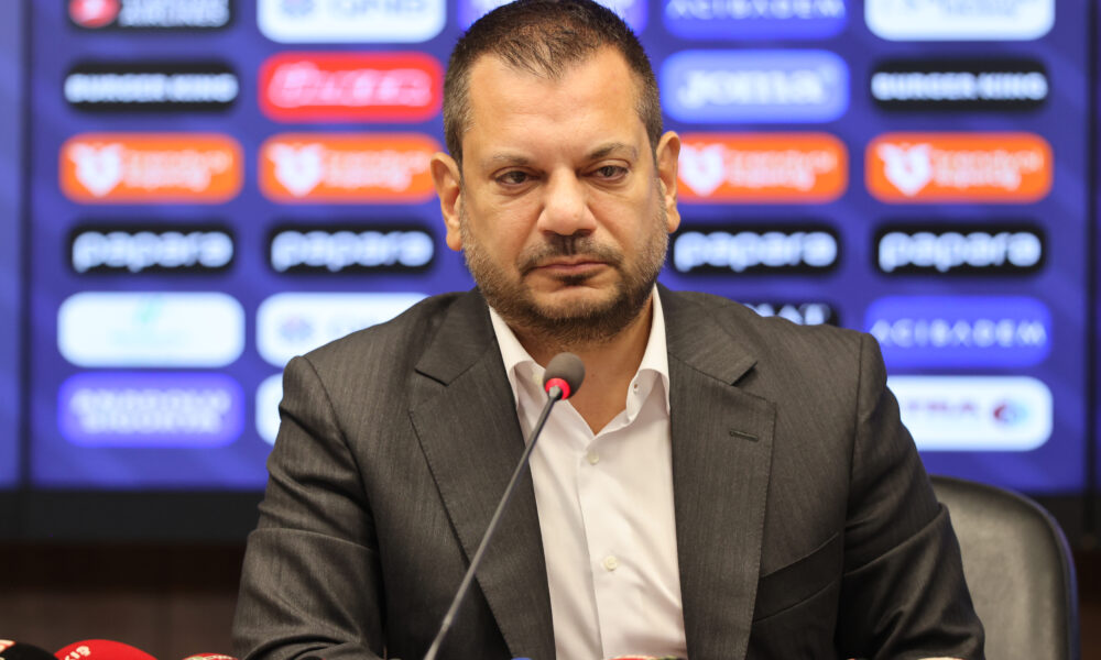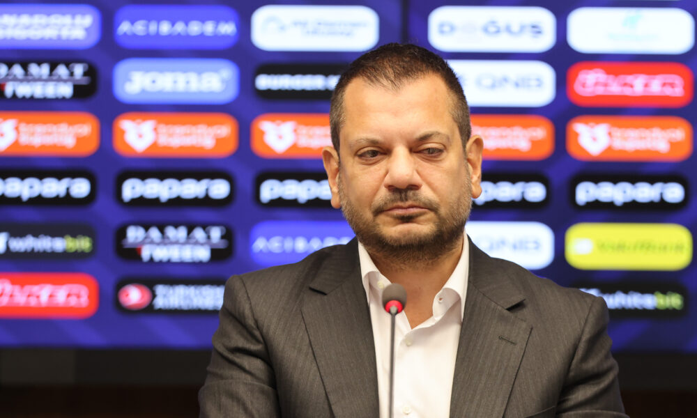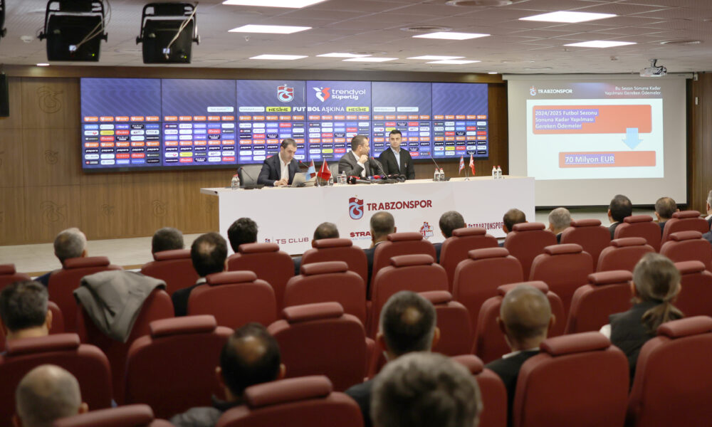 Trabzonspor Kulüp Başkanı Ertuğrul Doğan, Şenol Güneş Spor Kompleksi’nde düzenlenen basın toplantısında açıklamalarda bulundu. Fotoğraf: Trabzon,(DHA)