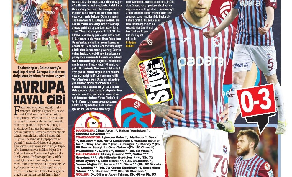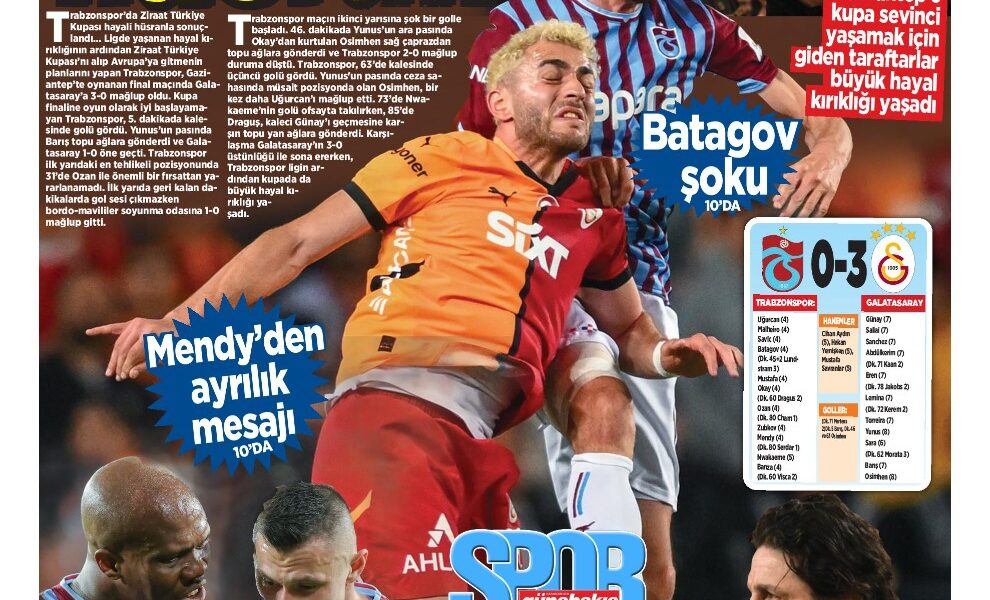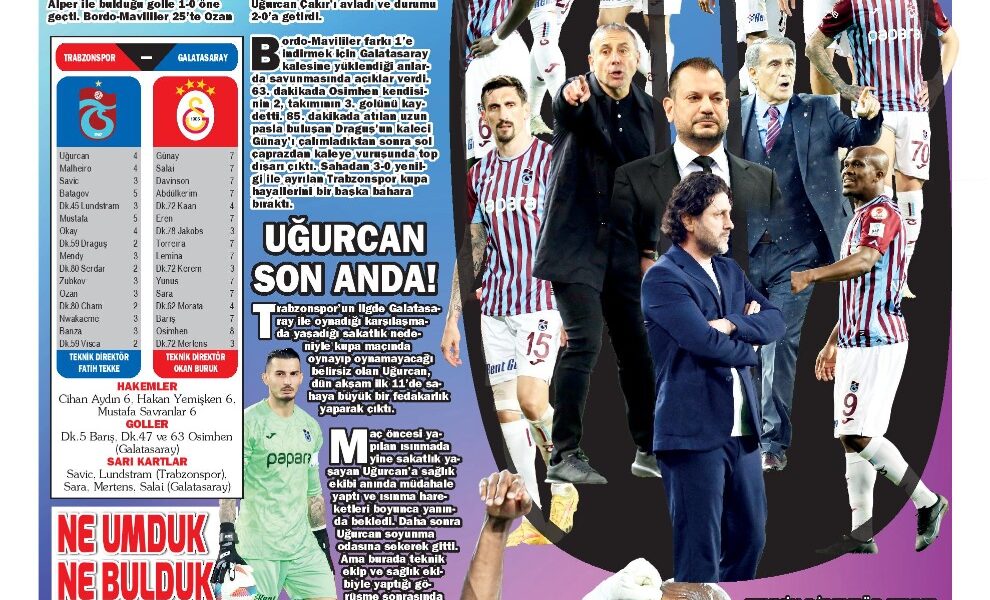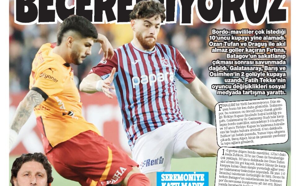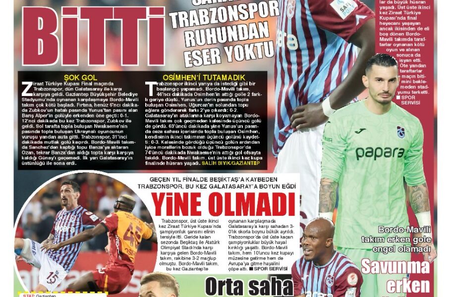 Öte yandan Trabzon’da yayın yapan yerel gazeteler de bordo-mavili takımın Galatasaray’a finalde mağlup olarak kupayı kazanamamasını farklı başlıklarla manşetlerine taşıdı.