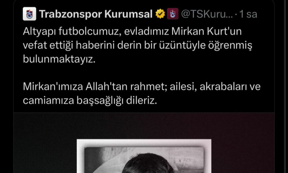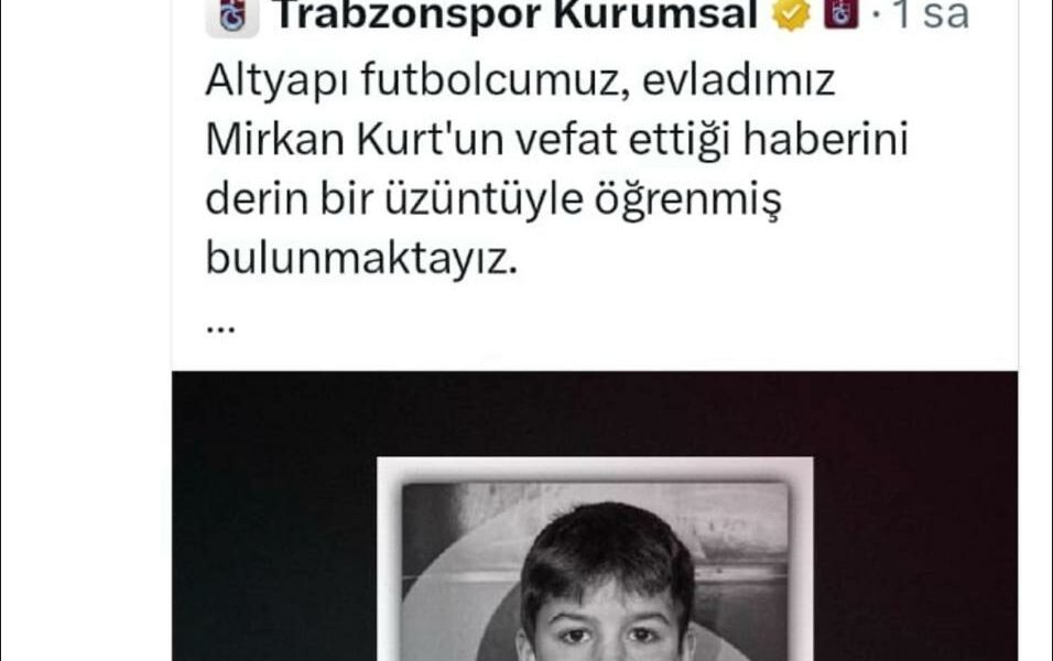 TRABZONun altyapı futbolcusu Mirkan Kurt (11), inşaattan düşüp yaşamını yitirdi. Kurt için Trabzonspor, Fenerbahçe ve Türkiye Futbol Federasyonu başsağlığı mesajı yayımladı.Trabzonspor’un U11 takımında futbol oynayan Mirkan Kurt, dün Ortahisar ilçesinde bilinmeyen nedenle inşaattan düştü. Çevredekilerin ihbarıyla olay yerine polis ve sağlık ekipleri sevk edildi. Ekiplerin ilk müdahalesinin ardından Kurt, ambulansla Karadeniz Teknik Üniversitesi (KTÜ) Tıp Fakültesi Farabi Hastanesi’ne kaldırıldı. Yoğun bakım servisinde tedaviye alınan Kurt, bugün tüm çabalara rağmen kurtarılamadı.FUTBOL CAMİASINDAN BAŞSAĞLIĞI MESAJLARIGenç futbolcunun ölümünün ardından futbol camiası sosyal medya hesaplarından başsağlığı mesajları yayımladı. Trabzonspor’un kurumsal sosyal medya hesabından yapılan açıklamada “Altyapı futbolcumuz, evladımız Mirkan Kurtun vefat ettiği haberini derin bir üzüntüyle öğrenmiş bulunmaktayız. Mirkanımıza Allahtan rahmet; ailesi, akrabaları ve camiamıza başsağlığı dileriz” ifadelerine yer verildi.Türkiye Futbol Federasyonu (TFF) tarafından yayımlanan mesajda ise “Trabzonsporun altyapısında forma giyen Mirkan Kurtun vefat ettiğini derin bir üzüntü ile öğrenmiş bulunuyoruz. Merhum Mirkan Kurta Allahtan rahmet; kederli ailesine, yakınlarına ve Trabzonspor camiasına başsağlığı dileriz” denildi.Fenerbahçe Spor Kulübünün paylaşımında da “Trabzonsporun altyapısında forma giyen Mirkan Kurtun vefat ettiğini derin bir üzüntü ile öğrenmiş bulunuyoruz. Mirkan’a Allah’tan rahmet; ailesi, Trabzonspor Kulübü ve camiasına başsağlığı dileriz” ifadeleri kullanıldı.