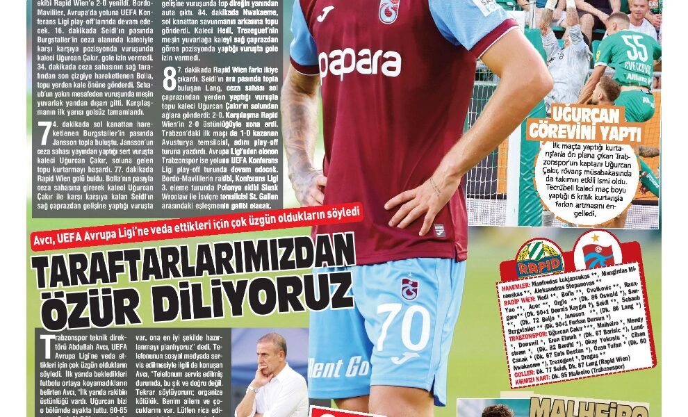 UEFA Avrupa Ligi 3’üncü Eleme Turu ilk maçında sahasında Avusturya temsilcisi Rapid Wien’e sahasında 1-0 mağlup olan Trabzonspor, dün akşamki rövanş maçında 2-0 mağlup olarak Konferans Ligi’ne kaldı. Bordo-mavililer UEFA Konferans Ligi’nde Play-Off turu oynayacak.