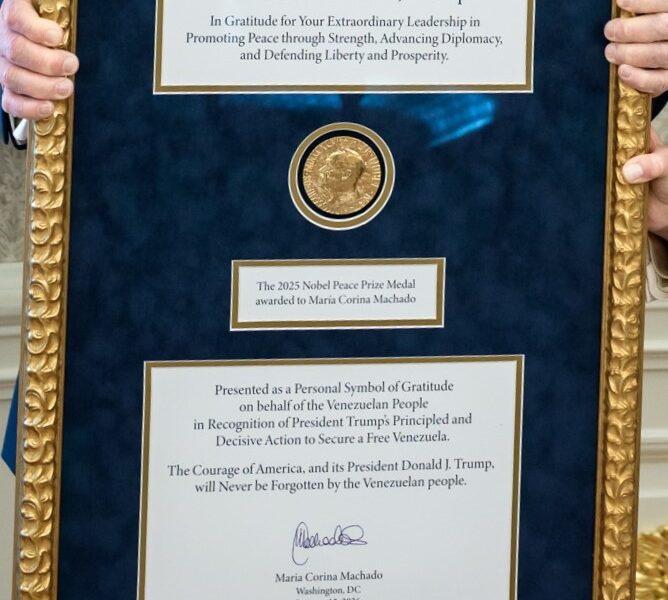 Görüşmede Machado, kendisine verilen 2025 Nobel Barış Ödülünü Trumpa takdim etti. Paylaşımında Machado’nun ödülünü kendisine sunmasından duyduğu memnuniyeti dile getiren Trump, “Maria, yaptığım çalışmalar için bana Nobel Barış Ödülünü takdim etti. Karşılıklı saygının ne kadar güzel bir göstergesi. Teşekkürler Maria” dedi.