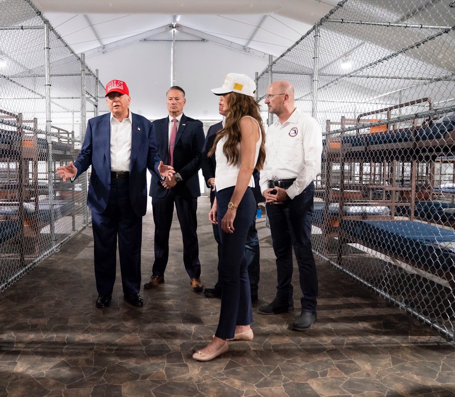 ABD Başkanı Donald Trump, ‘Timsah Alcatraz’ olarak adlandırılan Florida’daki düzensiz göçmenler için yapılan 5 bin yataklı yeni hapishaneyi ziyaret ederek incelemelerde bulundu. İç Güvenlik Bakanı Kristi Noem ve Florida Valisi Ron DeSantis ile hapishaneyi gezen Trump, burada gazetecilerin sorularını cevapladı.