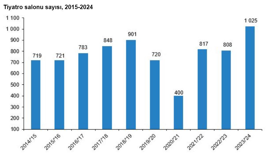 Tiyatro salonu sayısı 2023/24 sezonunda 1025 olurken, tiyatro salonu koltuk sayısı 431 bin 631 oldu. Devlet Tiyatroları seyirci sayısı 2023/24 sezonunda 1 milyon 794 bin 724 oldu. Tiyatro salonlarında oynanan eser sayısı, geçen sezona göre yüzde 18,5 artarak 9 bin 744 oldu. Tiyatroda çeviri eser seyirci sayısı yüzde 25 artarak 2 milyon 158 bin 41 olurken, telif eser seyirci sayısı geçen sezona göre yüzde 29,5 artarak 5 milyon 895 bin 145 oldu. 2023/24 sezonunda tiyatro salonlarında oynanan çocuk eseri gösteri sayısı 12 bin 474 olurken, yetişkin eseri gösteri sayısı yüzde 22 bin 929 oldu. Aynı sezonda çocuk eseri seyirci sayısı yüzde 0,9 azalırken, yetişkin eseri seyirci sayısı ise yüzde 46,2 arttı.