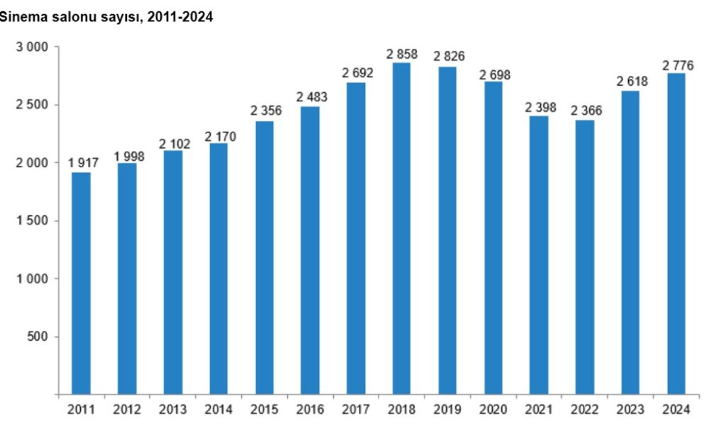 TÜİK, 2024 yılına ilişkin sinema ve gösteri sanatları istatistiklerini açıkladı. Buna göre; 2024 yılında 295i yerli 441i yabancı film olmak üzere toplam 736 filmin vizyona girdi. 2024 yılında sinema salonu sayısı 2 bin 776, sinema salonlarındaki koltuk sayısı 317 bin 274 oldu. Sinema seyirci sayısı, 2024 yılında 32 milyon 538 bin 289 kişi oldu. Yerli film seyirci sayısı 18 milyon 469 bin kişi olurken, yabancı film seyirci sayısı 14 milyon 68 bin 511 kişi olarak kayıtlara geçti.