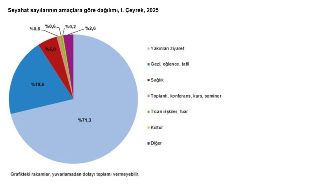 Bu çeyrekte, yakınları ziyaret amacı ile yapılan seyahatler yüzde 71,3 ile ilk sırada yer aldı. Seyahate çıkış amaçlarında ikinci sırada yüzde 19,6 ile gezi, eğlence, tatil, üçüncü sırada ise yüzde 5 ile sağlık yer aldı. Bu çeyrekte, seyahate çıkanlar 67 milyon 654 bin geceleme sayısı ile en çok arkadaş veya akraba evinde kaldı. Konaklama türlerine göre geceleme sayısında ikinci sırada 8 milyon 836 bin geceleme ile kendi evi yer alırken, otel 4 milyon 976 bin geceleme sayısı ile üçüncü sırada yer aldı.