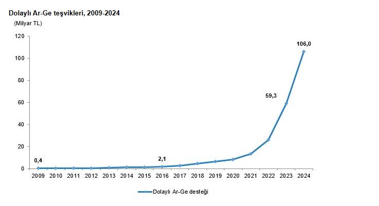 TÜİK, 2024 yılına ilişkin dolaylı Ar-Ge teşviklerini açıkladı. Buna göre; Ar-Ge faaliyetlerine yönelik toplam vergi teşviki 2023 yılında 59 milyar 332 milyon TL iken, yüzde 78,6 artış göstererek 2024 yılında 105 milyar 977 milyon TL oldu. Dolaylı Ar-Ge teşviklerinden yararlanan girişimler, 53 milyar 926 milyon TL ile en fazla gelir vergisi stopaj teşviki desteğinden faydalandı. Bu vergi desteğini sırasıyla 50 milyar 552 milyon TL kurumlar vergisi, 1 milyar 399 milyon TL ile gelir vergisi desteği, 99 milyon TL ile katma değer vergisi (KDV) desteği izledi. Beyan edilen Ar-Ge harcamalarına göre sağlanan dolaylı Ar-Ge teşviklerinin yüzde 49,1inin kurumlar vergisi, gelir vergisi ve KDVden, yüzde 50,9unun ise gelir vergisi stopaj desteğinden geldiği görüldü.