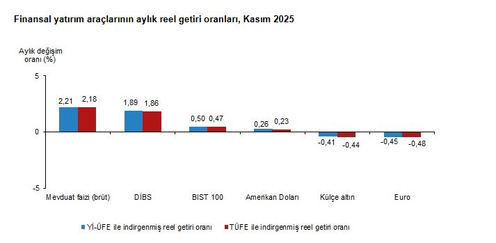 TÜİK, Kasım 2025 dönemine ilişkin finansal yatırım araçlarının reel getiri oranlarını açıkladı. Buna göre; aylık en yüksek reel getiri, yurt içi üretici fiyat endeksi (Yİ-ÜFE) ile indirgendiğinde yüzde 2,21, tüketici fiyat endeksi (TÜFE) ile indirgendiğinde ise yüzde 2,18 oranlarıyla mevduat faizinde (brüt) gerçekleşti. Yİ-ÜFE ile indirgendiğinde yatırım araçlarından, Devlet İç Borçlanma Senetleri (DİBS) yüzde 1,89, BİST 100 endeksi yüzde 0,50 ve dolar yüzde 0,26 oranlarında yatırımcısına reel getiri sağlarken, külçe altın yüzde 0,41 ve avro yüzde 0,45 oranlarında yatırımcısına kaybettirdi. TÜFE ile indirgendiğinde ise DİBS yüzde 1,86, BİST 100 endeksi yüzde 0,47 ve dolar yüzde 0,23 oranında yatırımcısına reel getiri sağlarken, külçe altın yüzde 0,44 ve avro yüzde 0,48 oranlarında yatırımcısına kaybettirdi.